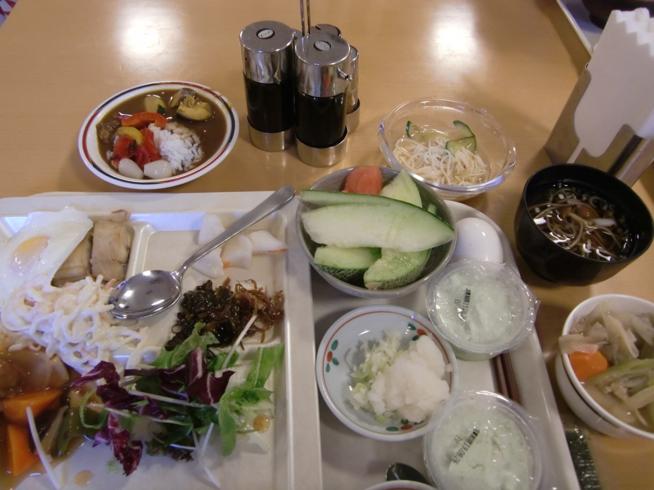 朝食・バイキングが凄い!ダダチャ豆の豆腐・庄内風芋煮鍋・こんにゃく・そうめんひや汁・夏野菜の薬膳カレー・メロンは潤沢・特製黒酢ヨーグルト・ぶどうと紫野菜ジュースが美味。