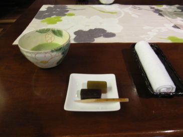 ウエルカムドリンクはお抹茶と和菓子、部屋は少し古い感じですが清潔に整っています。