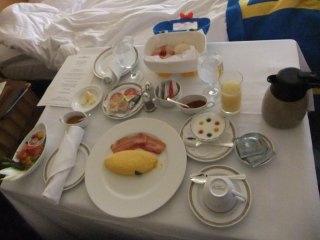 通路が狭いのでベランダ側のテーブルで食べる場合は1つ1つ運んでくださるようですが、ベッドサイドにカートごとセッティングしていただきました。