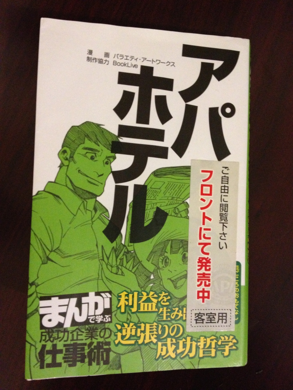 アパホテルのことは全く知らず泊まりましたが、部屋に「アパホテル」という漫画が置いてあり、どのようにアパホテルがここまで大きくなってきたのか、いかにお客さん目線に立って細かな所まで考えているかということなどを見ることができ、そのホテルに泊まっていることが嬉しくなりました。漫画も暇つぶしになって良かったです。