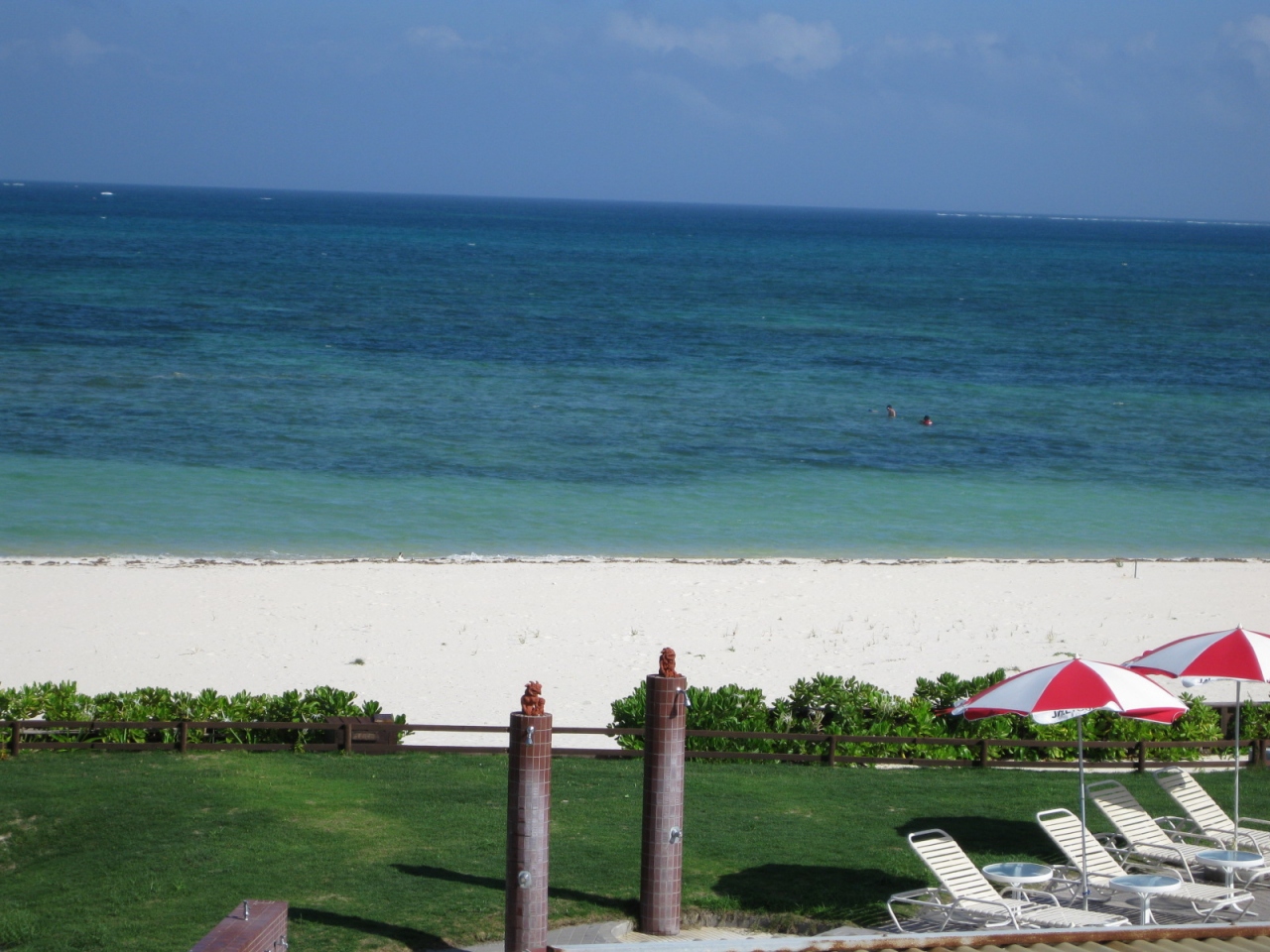 一度久米島に行ってみたかったので、ビーチフロントのイーフビーチホテルを選んだ。立地は抜群に良かったが、建設されてから年月がたち、いたるところに古さが感じられる。一応改装はされているが、館内の壁面などに塗料の塗跡が目立ち、部屋のベットや椅子に染みが残っていた。修学旅行生の宿になっていて、高級感はない。