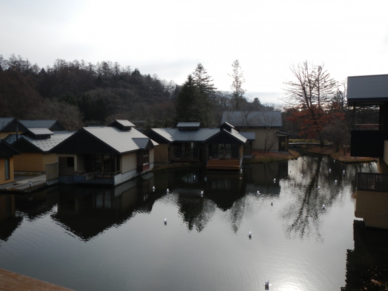 一つの建物に客室が数部屋あり、その建物が広い敷地の川や通りに沿っていくつも立っています。