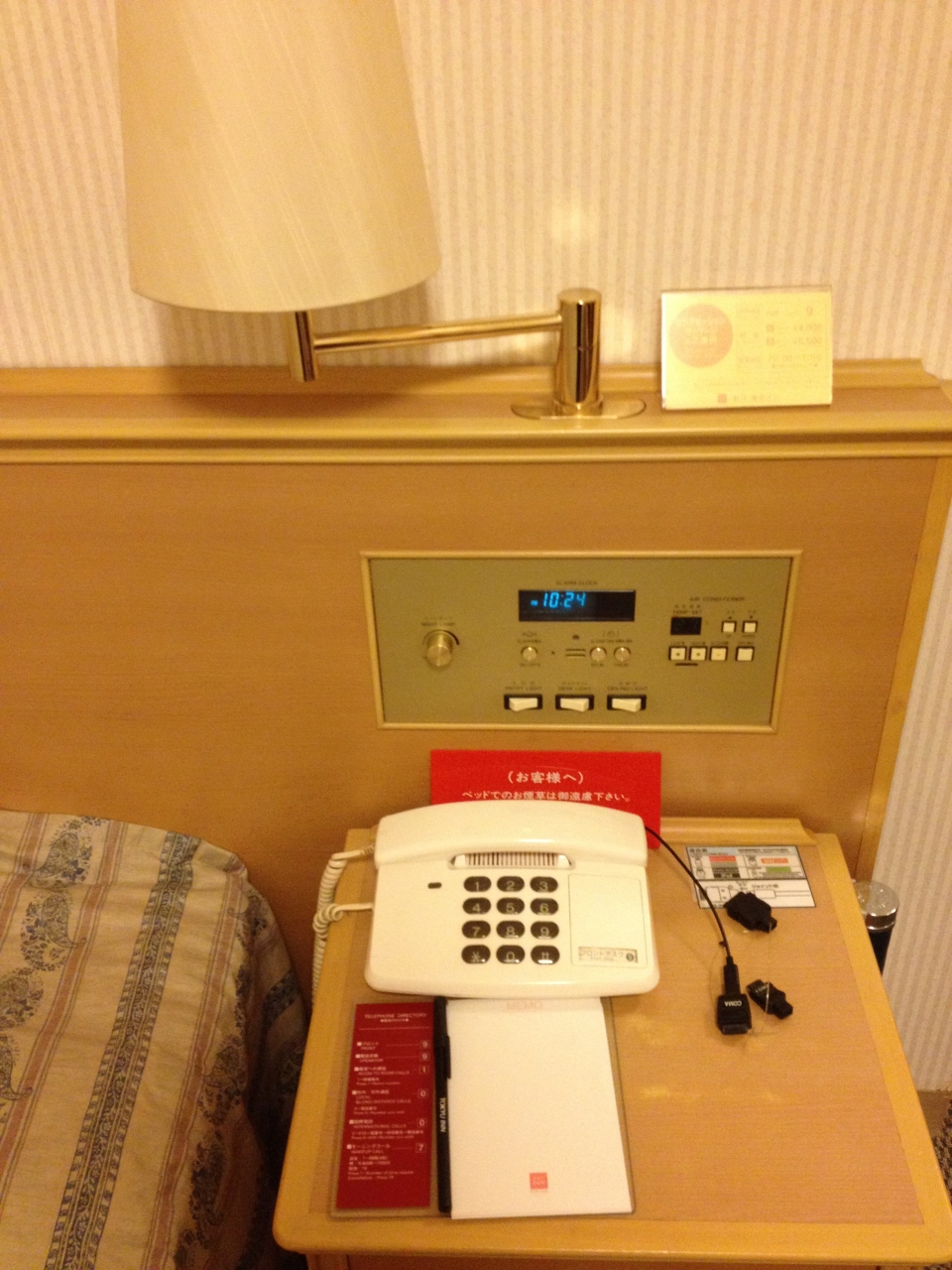 出雲観光でツアーに組み込まれていたホテルです。友人と行きましたがホテルはシングルを別々に2泊お世話になりました。少し、年期の入ったホテルで、禁煙ルームの指定ができなかったのでとてもたばこ臭い部屋でした。空気清浄機が部屋に置いてあり利用しましたがそう簡単には臭いは取れないですね。ベッドもたばこ臭くて、寝てる時にうっ。となってしまいました。Wi-Fi完備とベッドサイドに携帯やiPhone(タッチ用でしたが)充電コードがあるのは便利でした。iPhone5に対応してるコードはなかったです。