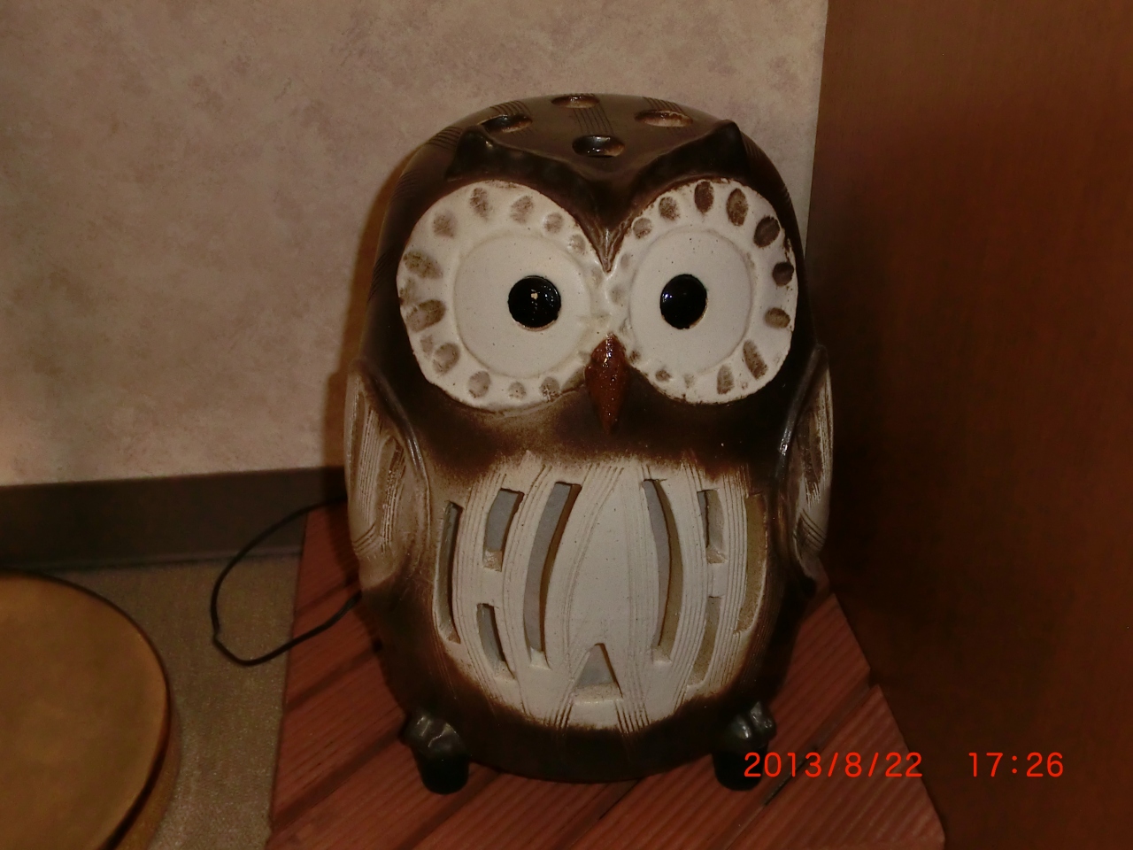 部屋には信楽焼のフクロウ型空気清浄機【ほっこりにっこり】が置かれ、窓からはお城が見渡せ,夜はライトアップで浮き上がっていました。
