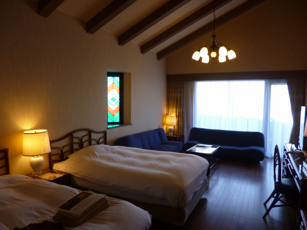 何にもない静かなロケーションです。その何もない(温泉しかない)ロケーションが贅沢でもあります。今回はコテージタイプのお部屋に宿泊しました。広めのお部屋で天井が高く、非日常を味わうことのできるお部屋でした。建物やソファなど少し古いですが、ベッドはフカフカでなんと!数種類の中から枕を選ぶことができるんです!もちろん無料で。