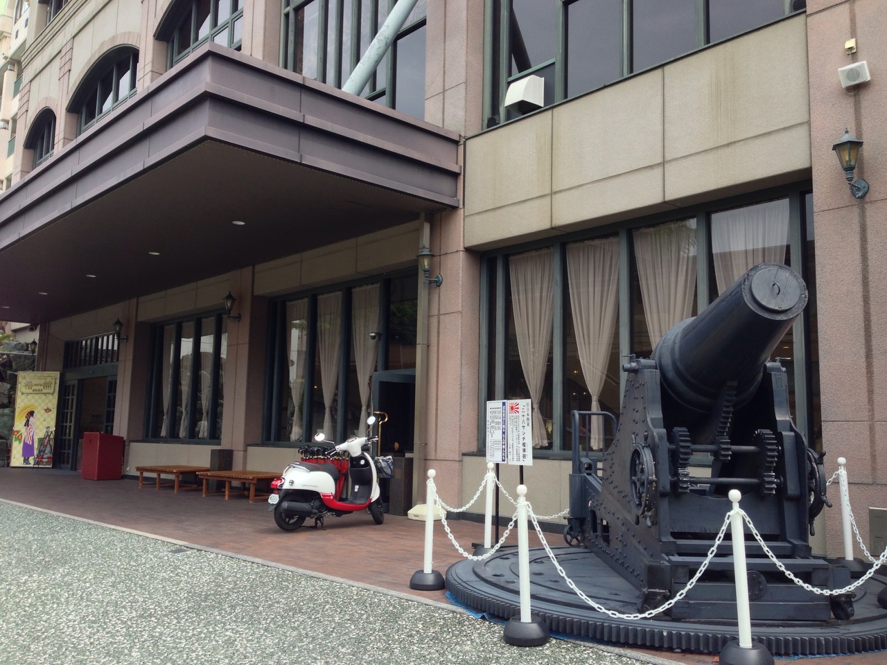 ホテルの前には、大砲のレプリカ、中には戦艦などの模型がありましたが、