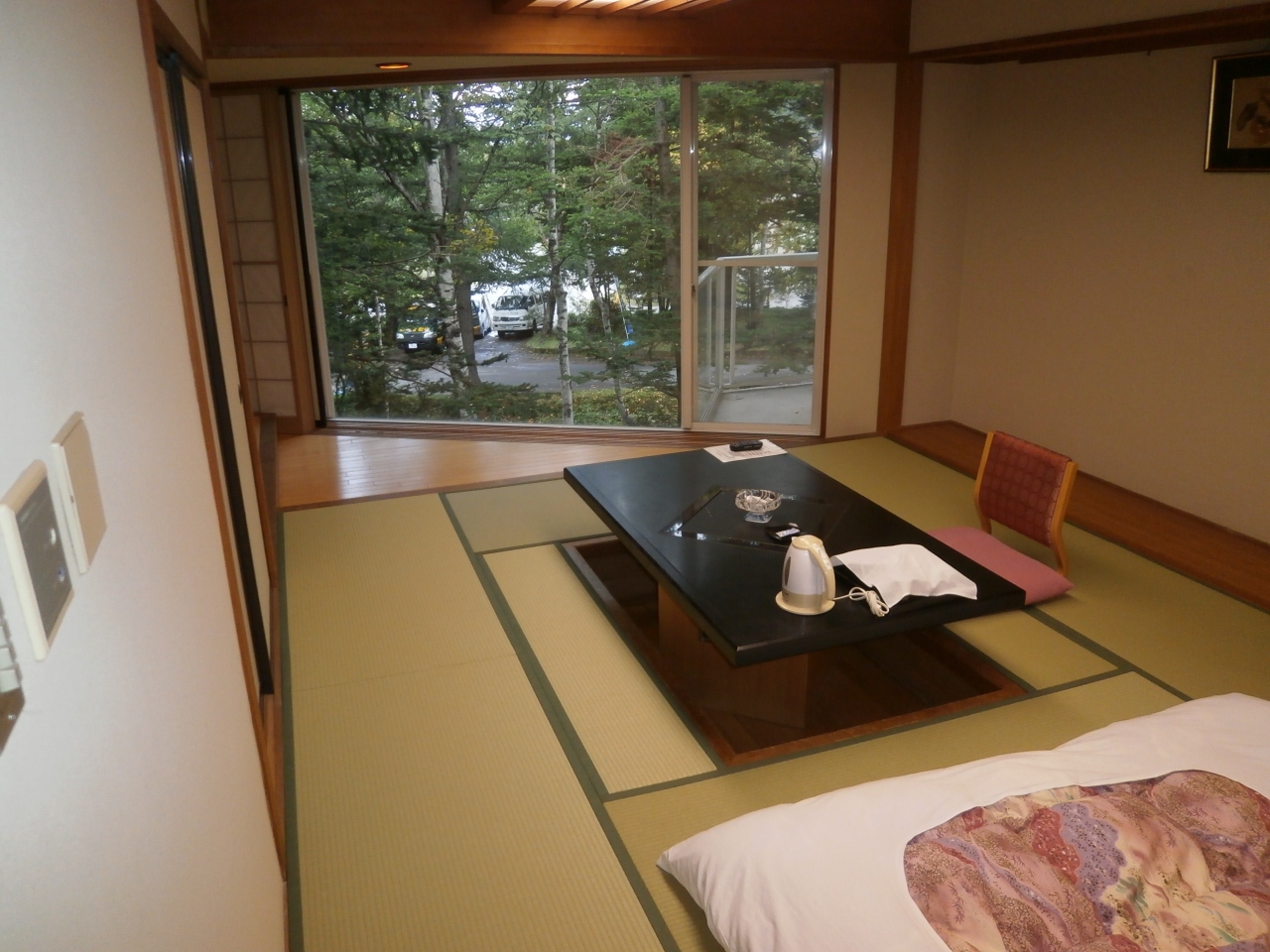 入口から畳敷き、靴を脱いで上がります。部屋は和室、布団は敷かれていました。