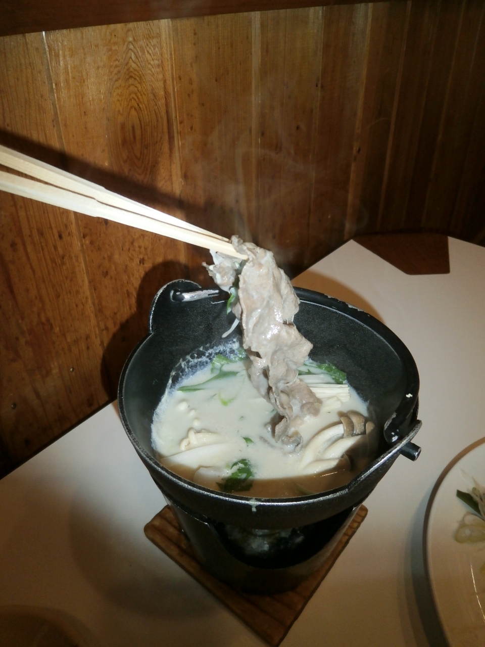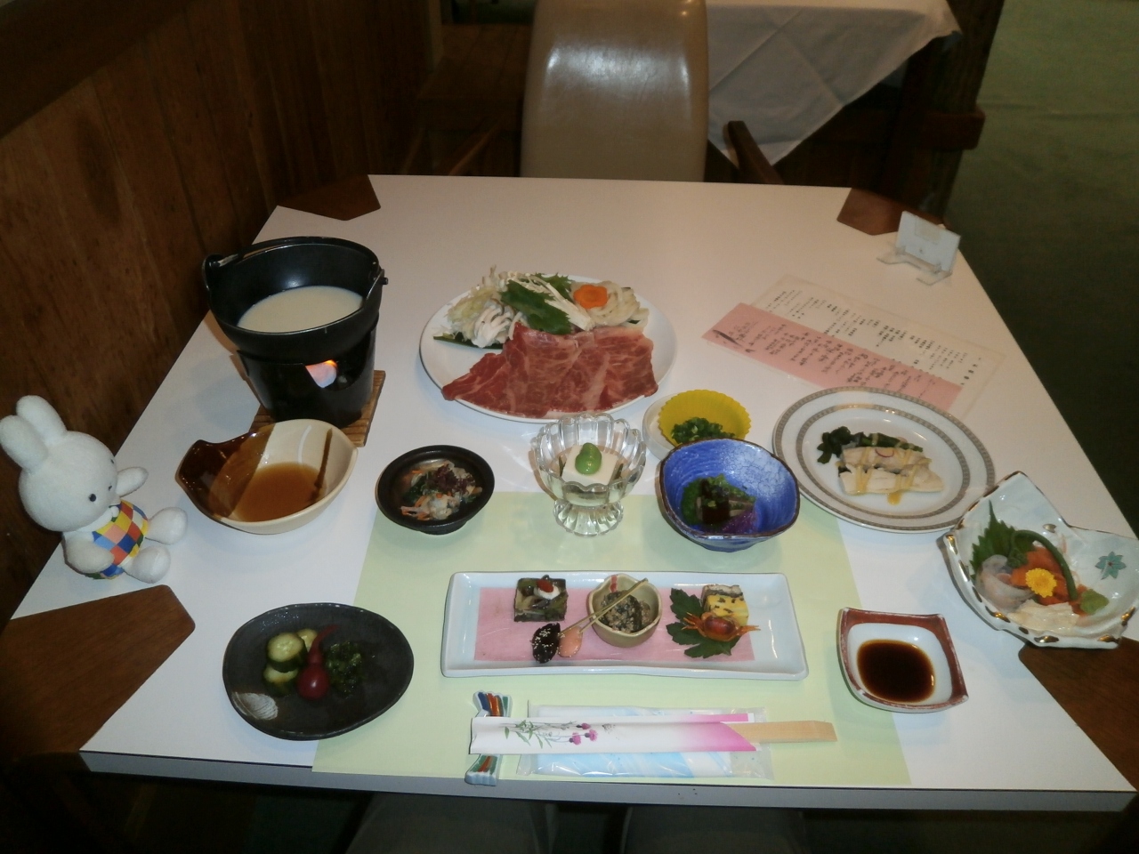 夕食は栃木牛を使った豆乳鍋とゆば刺し。朝食も和食ですが、大豆を使ったお肉のような食感のようなものが妙に不思議な味がしました。美味しかったです。