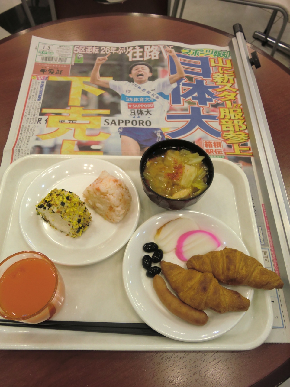 朝の食事もふりかけのかかったお握り、パン、味噌汁に漬物とコーヒーです。