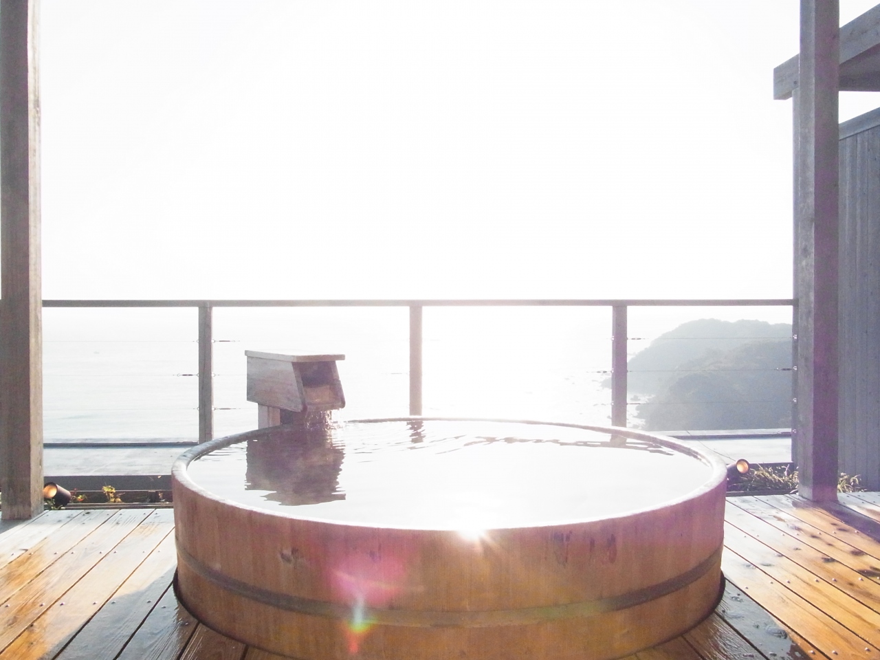 貸切露天風呂は朝に利用しましたが、目の前の海と朝日に照らされながら入る露天風呂は最高に贅沢です。露天風呂にはベンチもあり、お風呂から上がった後も、そこで景色を眺めることができなす。