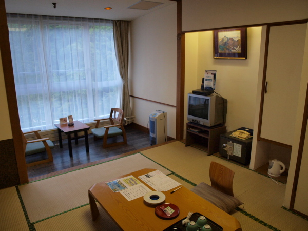 温泉は大浴場と中浴場があり、2~3時間おきに男女が入れ替わります。中浴場でも充分広く、透明ながら湯の花が浮かぶいいお湯でした。いちおう露天風呂はありますが、景色は見えません(川風は心地よかったですが)。朝食はバイキングで、価格相応といったところでしょうか。