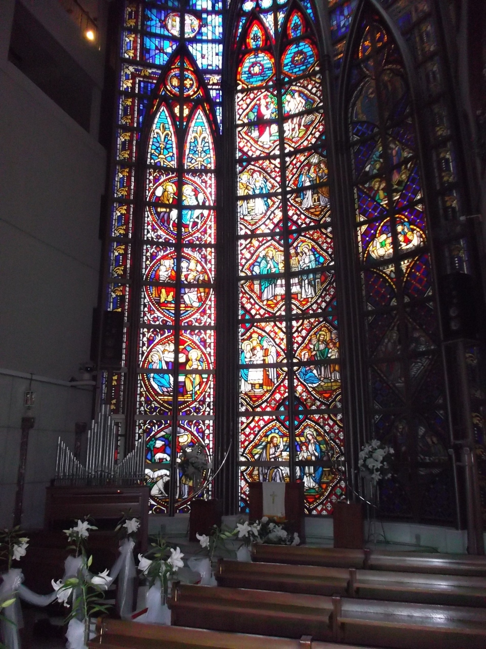 吹き抜け空間のステンドグラスの結婚式場が見もの、圧巻します。