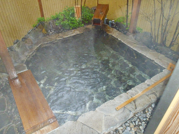 メゾネットタイプになっていて2階にベッドルームがあり、部屋の露天風呂は源泉掛け流しでした。