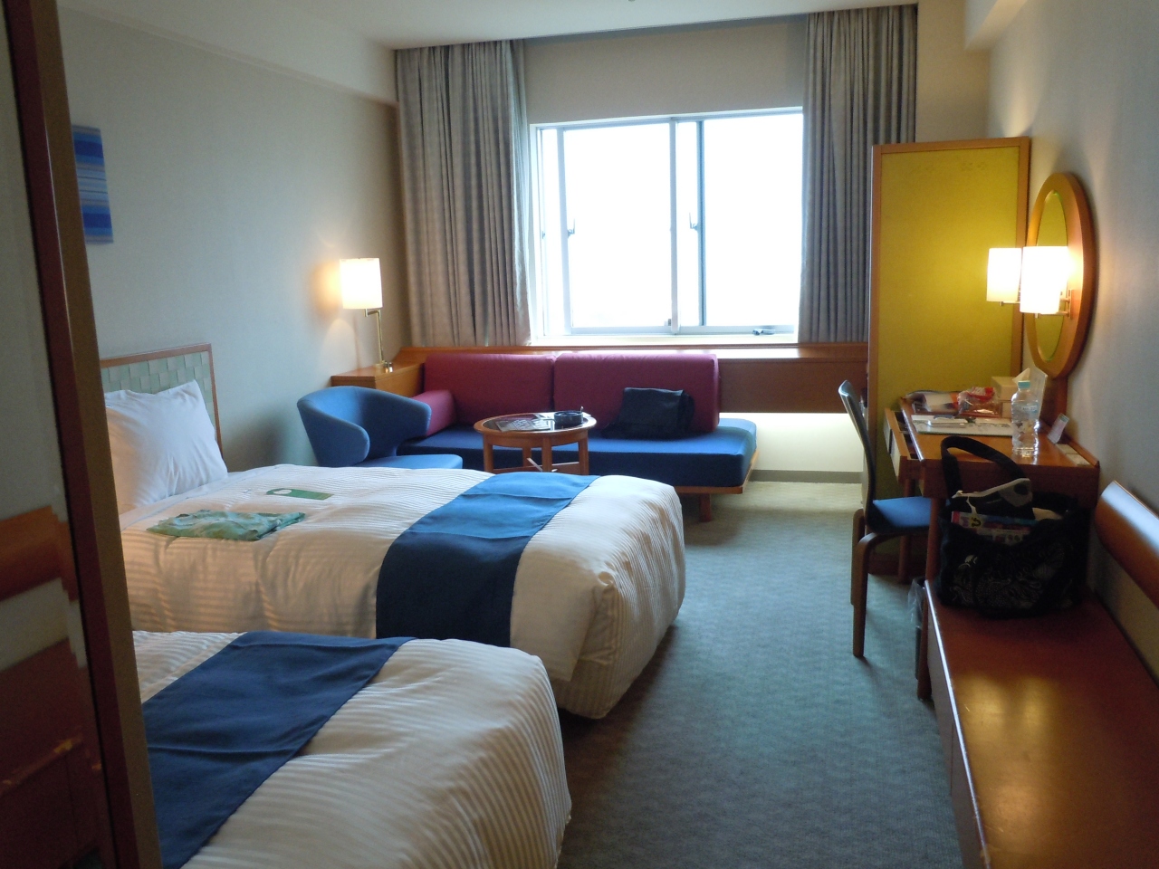 部屋は上層のツインの一人使いで、新しくはないが広くて窓からは海もみえる。部屋のドライヤーが弱いのでフロントに伝えたらたら予備は無いと言われたが数分後に持ってきて貰えました。