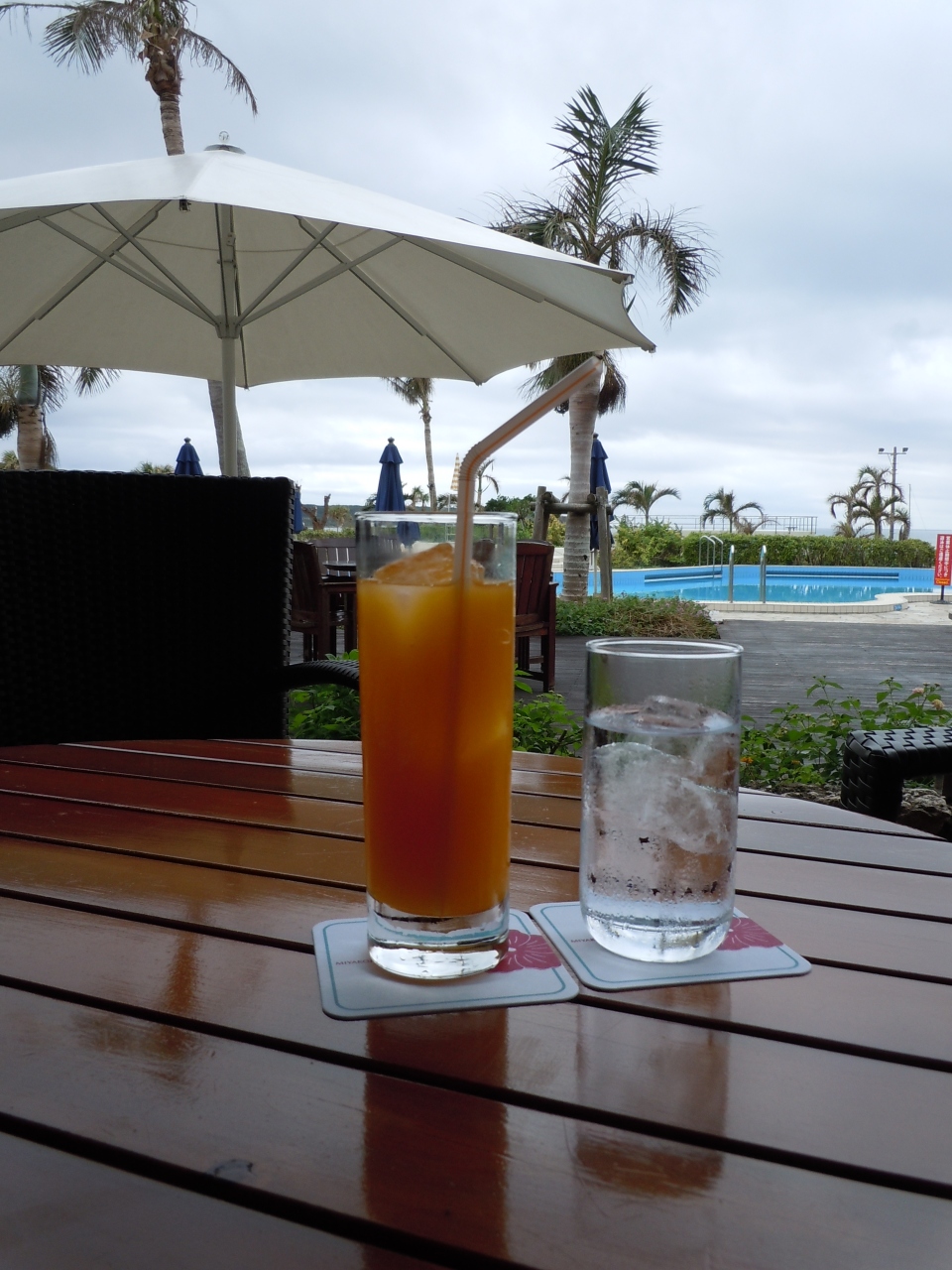 ランチはテラス席でマンゴージュースと海の幸パスタでしたがハーフのメニューが少食の私にはうれしかった。