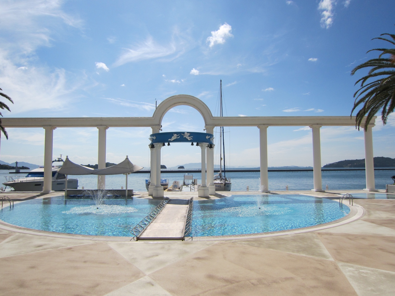 入り口を入ると、「わー素敵。」目の前に真っ白なゲートと真っ青なプールのある中庭が、見えました。
