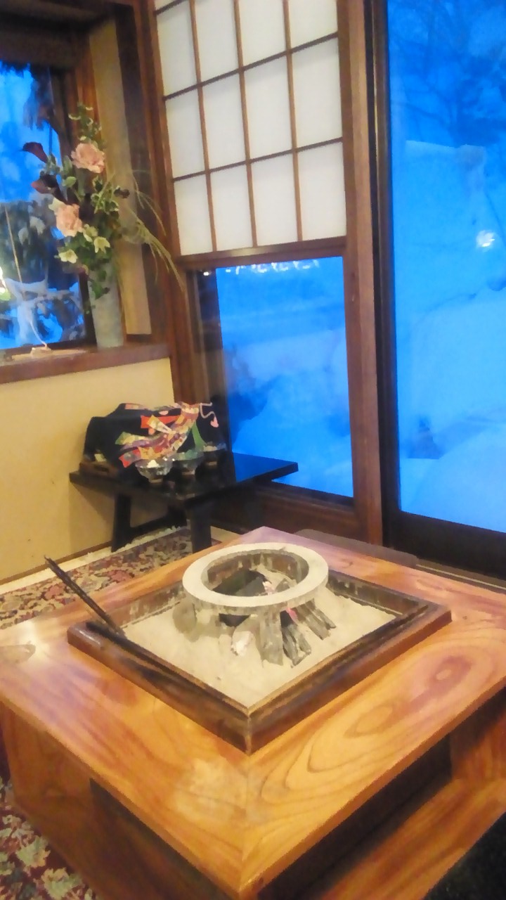 囲炉裏できのこ汁をあたためる演出もなかなかでした。