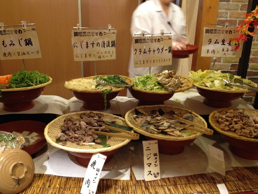 紅葉の季節に連泊しました。夕食がバイキングのプランにしたのですが、料理の中に「鍋放題」というのがあり、ミニ鍋に自分で具材やスープを選んで入れて好きな鍋ができるというものでした。バイキングも2日続くと飽きるのですが、1日目は普通の料理、2日目は鍋にしたので飽きずにすみました。ただ、具材の肉は羊と鹿ですので、ちょっと(かなり)クセがあります。