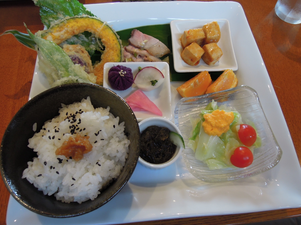 目の前は道路を挟んで海ですが、フェンスなどがあり眺望はいまいちかなと思います。ここにはカフェが併設されているのですが、とにかくここが美味しいです。カナンプレートは自家農場直送の素材づくし。食後にはぜひ塩パインアイスやパイを。これがまた美味しいです。