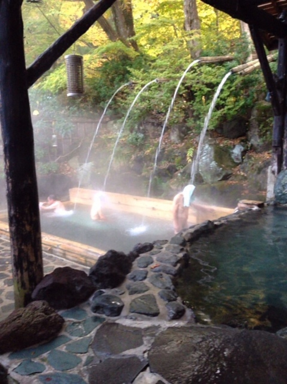 こちらのお宿の露天風呂には驚かされました。いやー、4本の打たせ湯が豪快に滝のごとく流れている様子は、温泉に来た~!!という感動モノです。露天風呂とそのすぐ横に打たせ湯があり、露天風呂に入って浸かりながら、豪快な打たせ湯の景色を楽しむもよし、打たせ湯で頭から打たれても良し。また4箇所あるのですが、深さを変えてあり、腰が当たりやすくすることもできました。