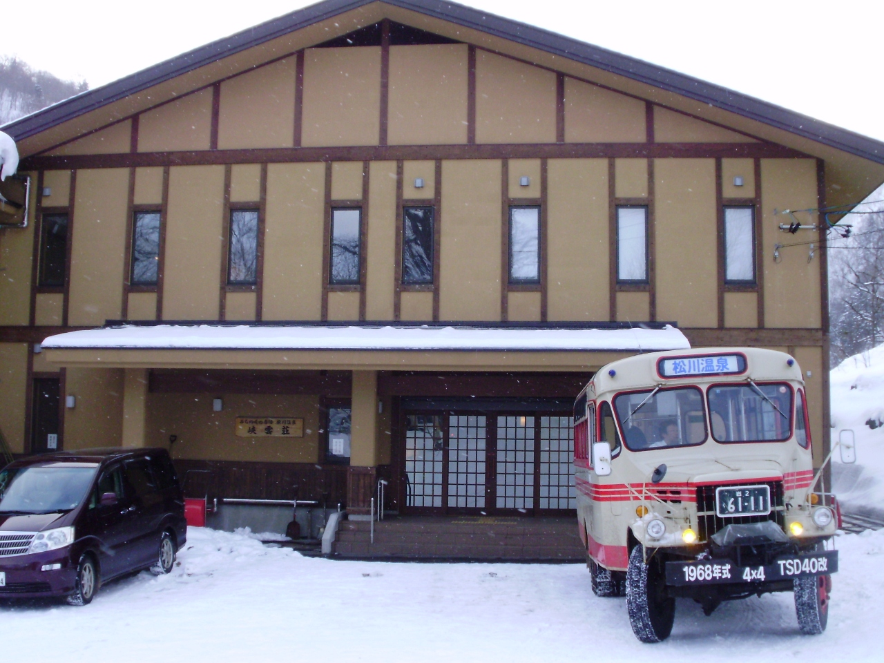 松川温泉へは、八幡平ロイヤルホテル前からボンネットバスで行きました。チェーンを巻いたバスで、雪道も力強く走ってくれました。冬期間は、この区間は通行止めがあり、松川温泉が終点となります。宿の前がバス停で、便利です。折り返しのバスも、こちらで発車時間まで待機していました。