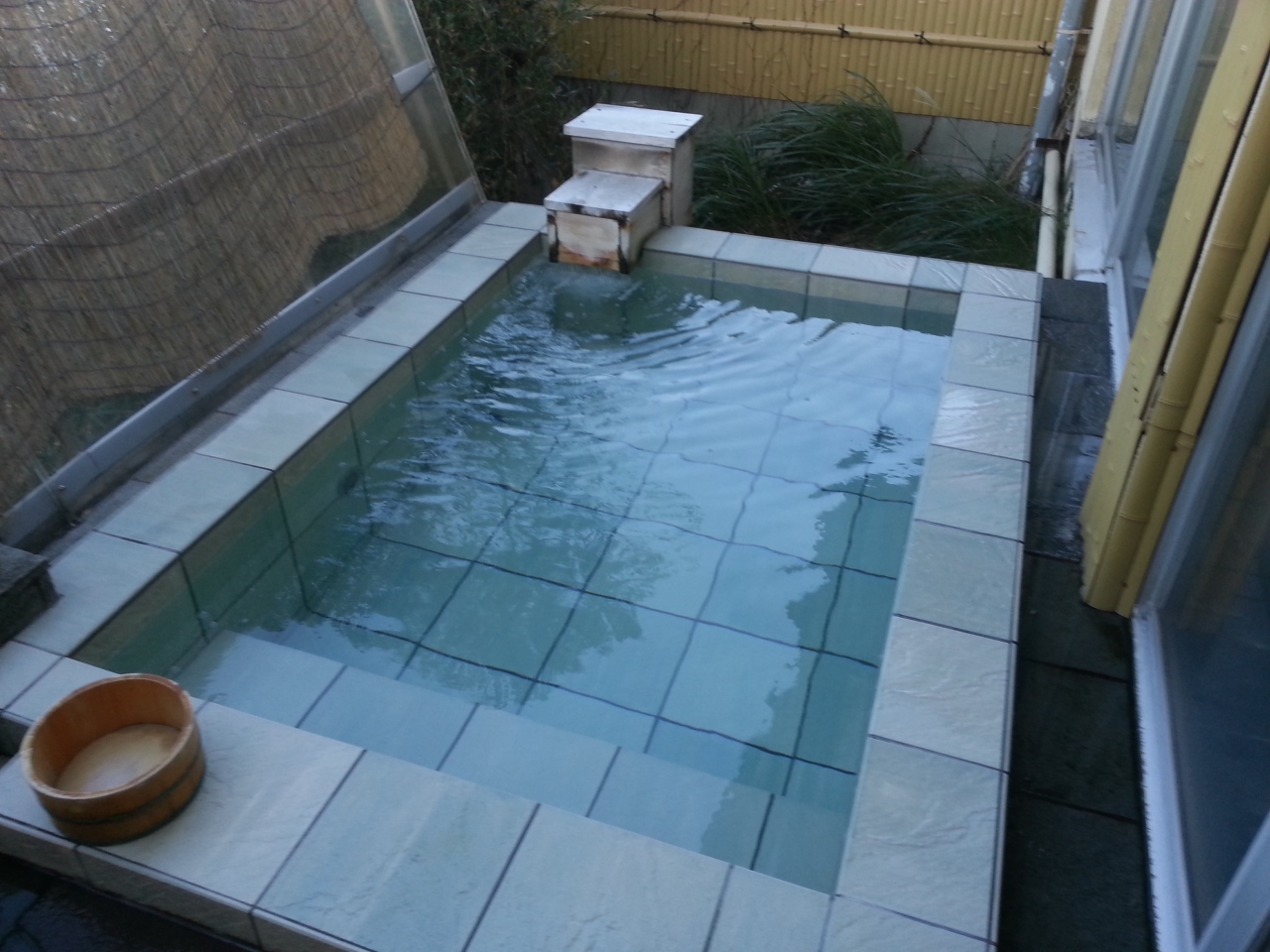 露天風呂は目隠しの柵が少し低いので、浴槽から出ると下半身がギリギリ隠れるくらいなので、もう少し柵を高めにして欲しいかな〜。(男風呂)