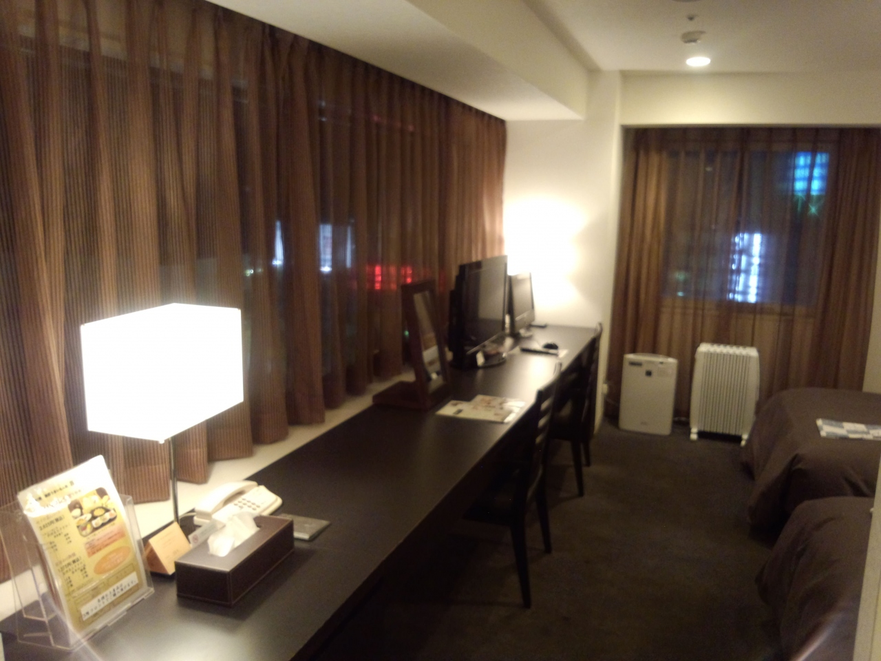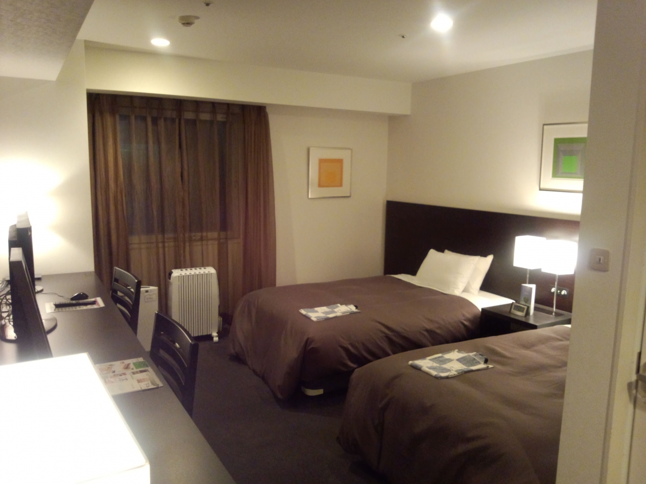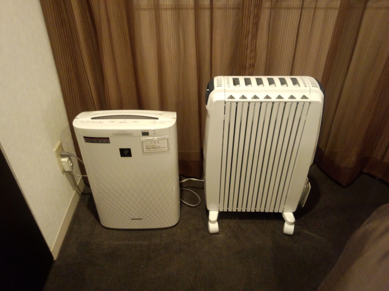 今回は角部屋のツインにアップグレードしてくださり、広~い部屋にはデロンギのオイルヒーターがありました。エアコンの暖房に比べて乾燥せずにやんわりと空気が温まるのでつけっぱなしで快適に就寝できました。