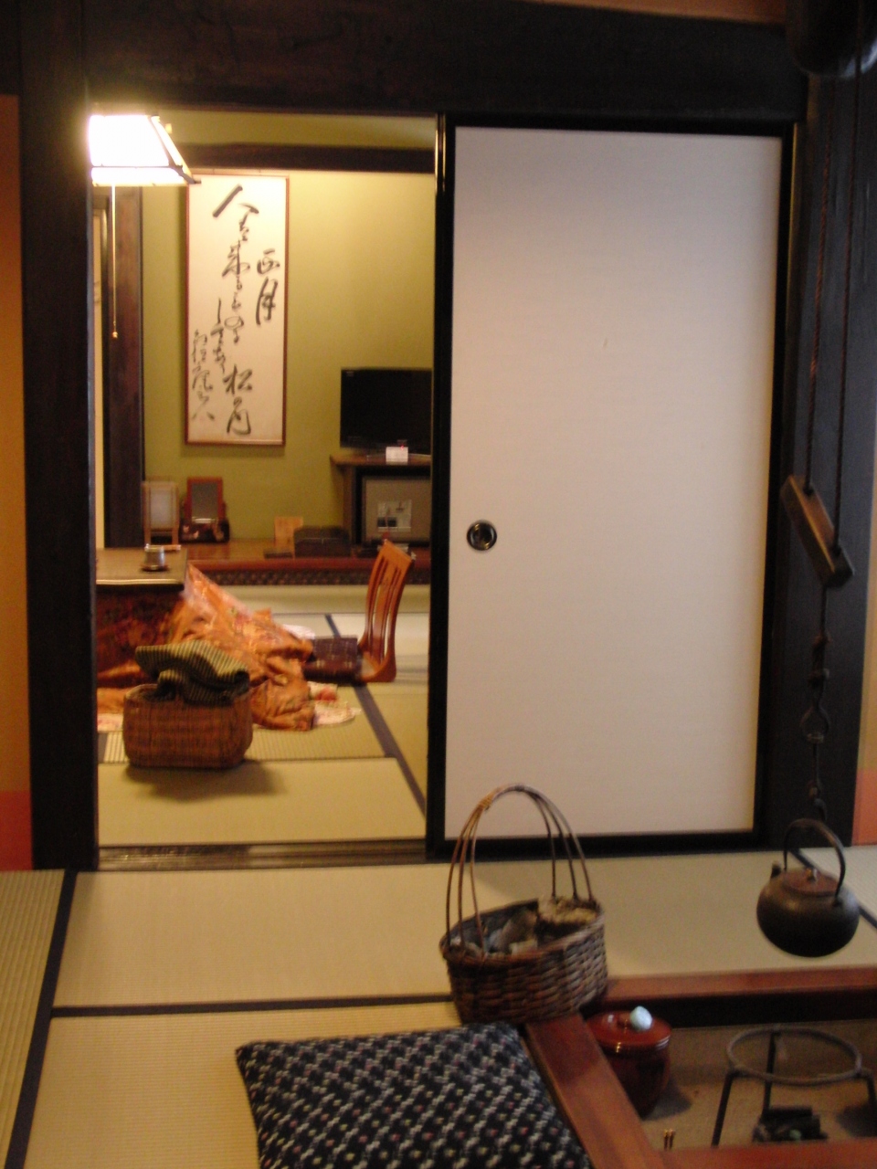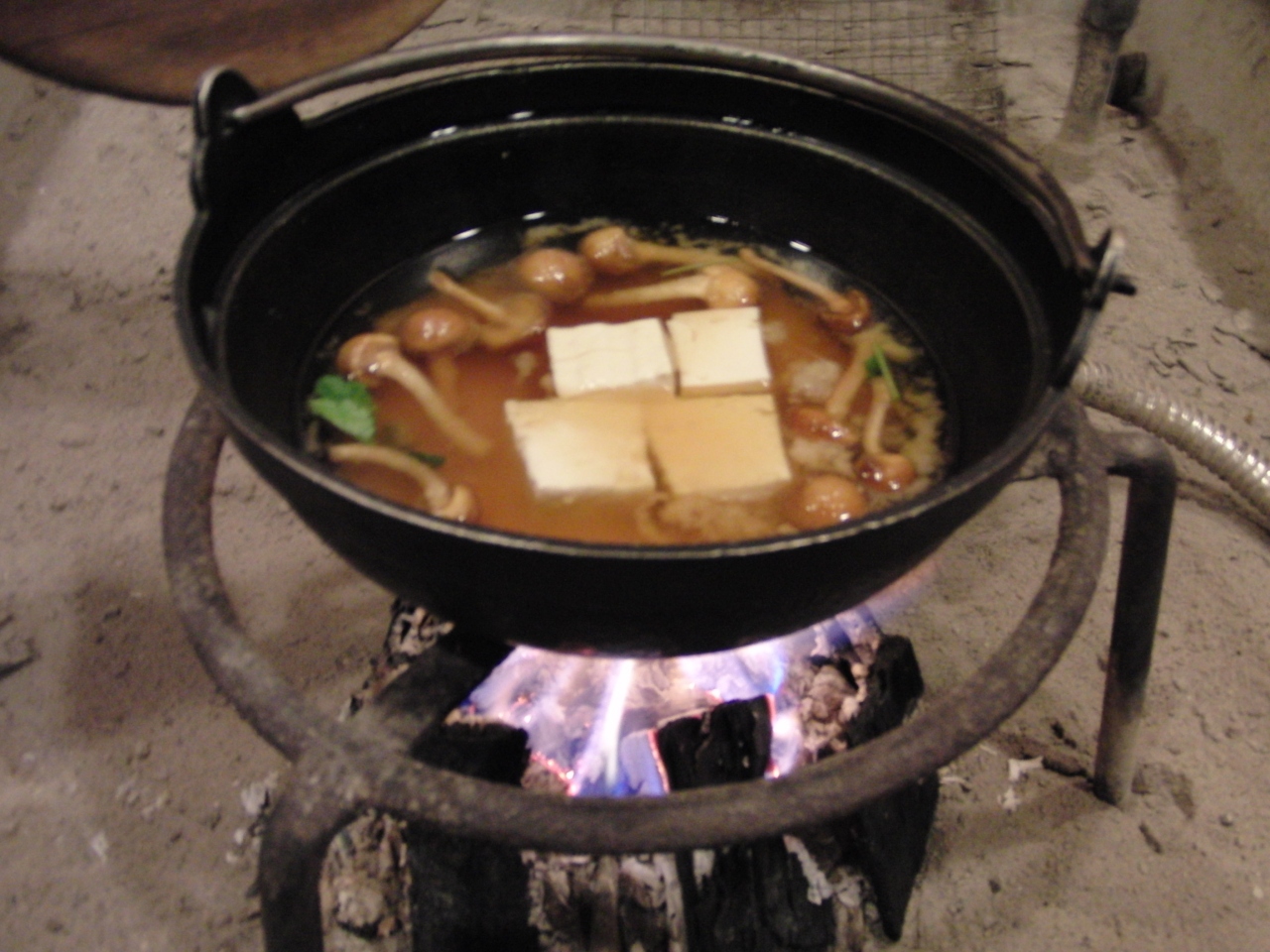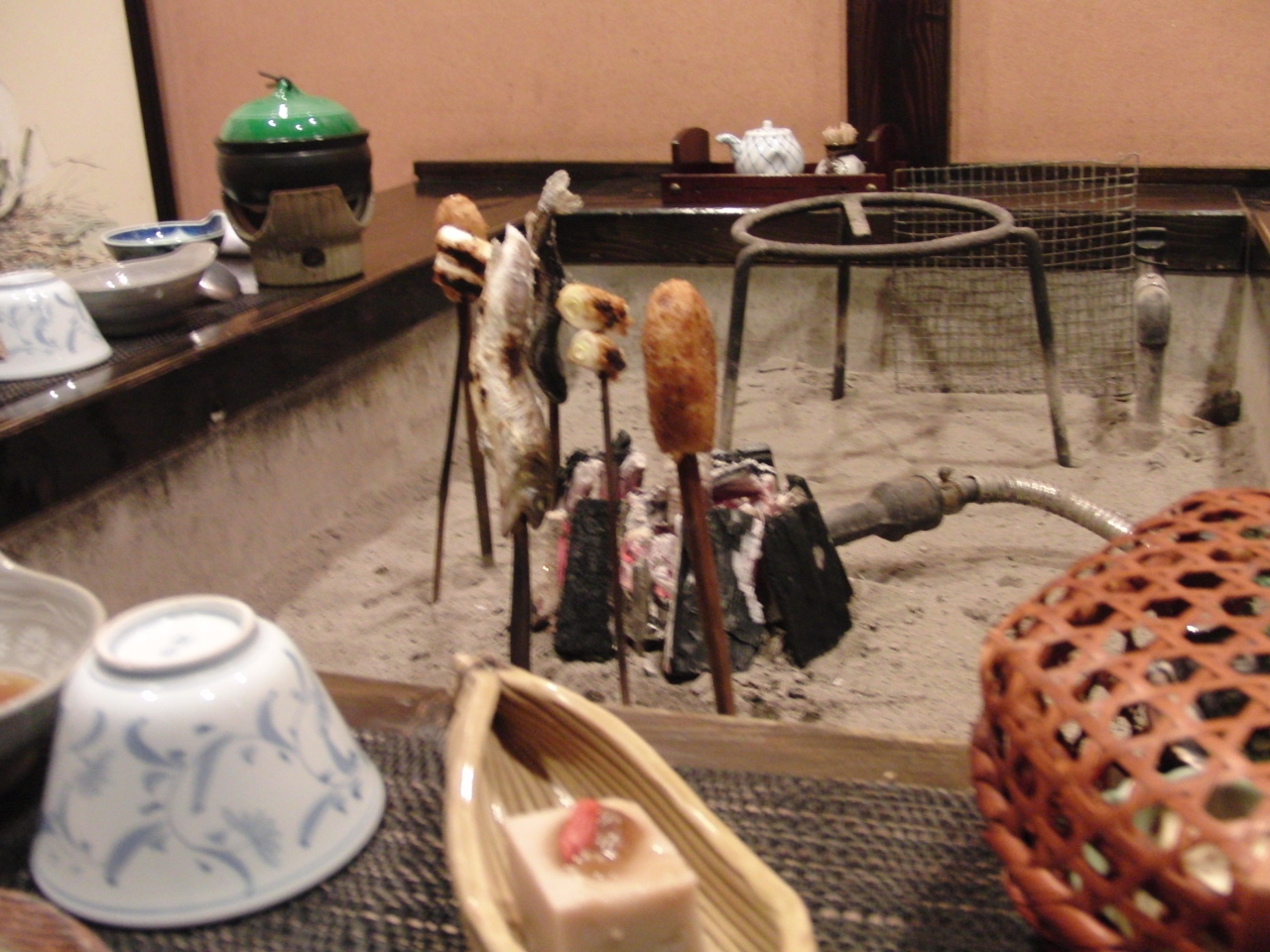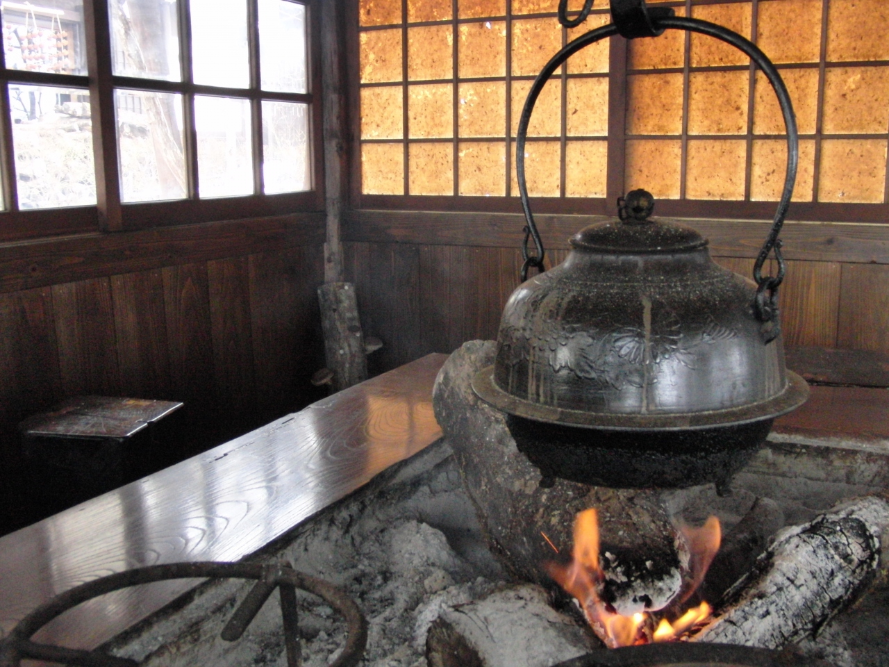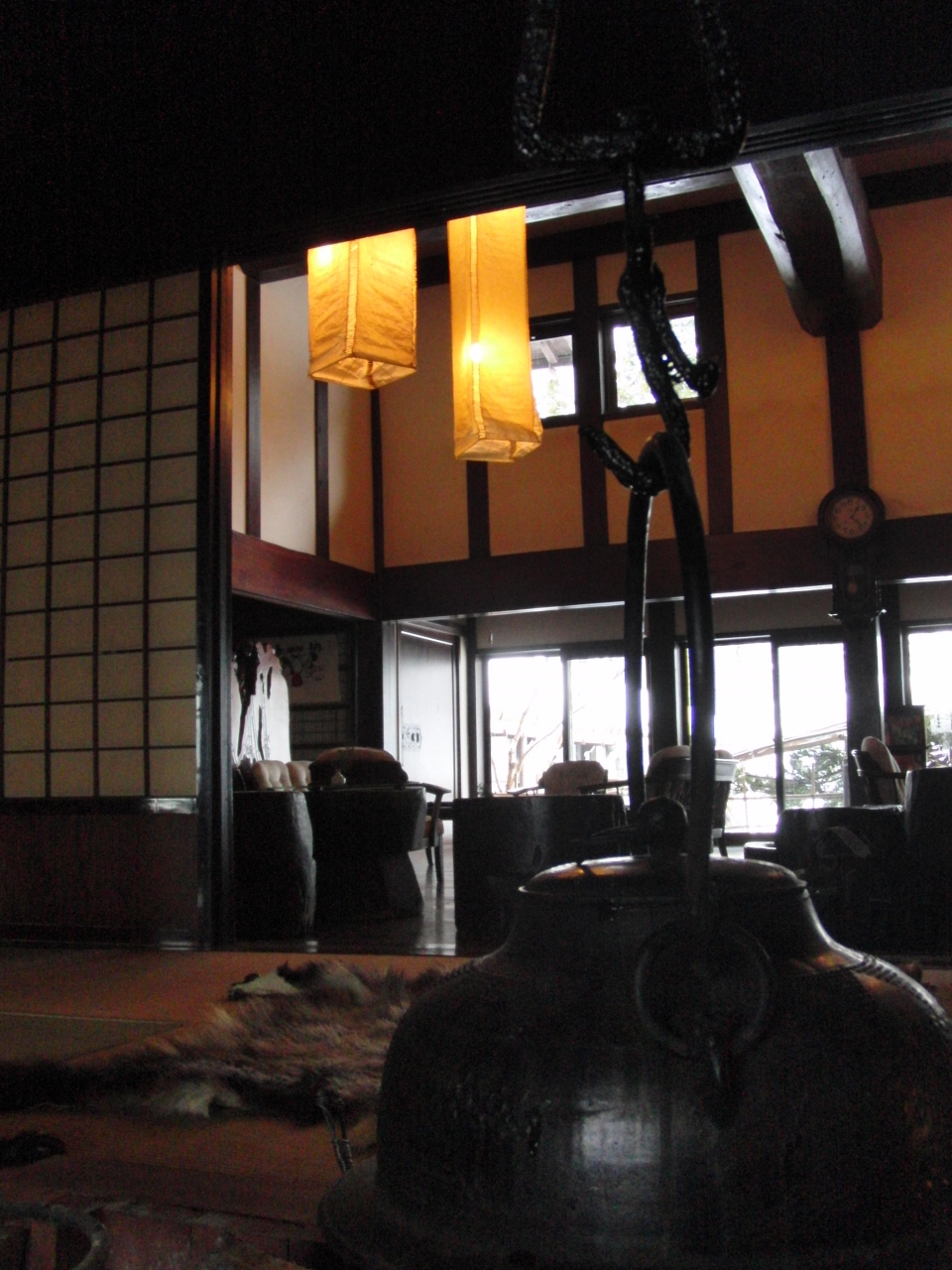玄関前の囲炉裏小屋、玄関、ロビー・・・、すべてが静かで穏やかでした。囲炉裏にくべられた薪のパチパチはぜる音や土瓶の湯の沸く音が、心を癒します。