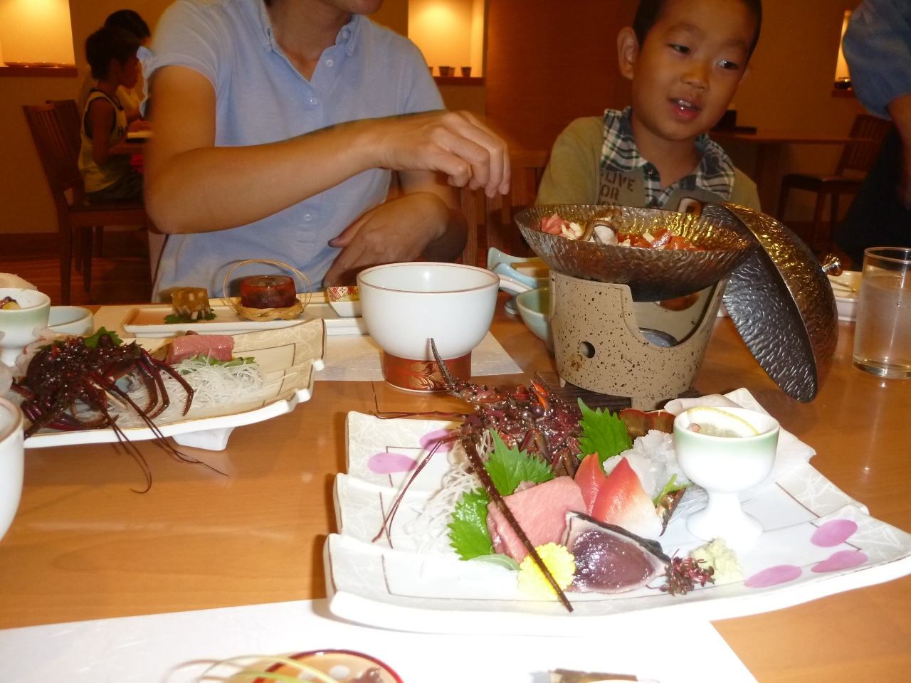 夕食はイセエビあり、金目鯛ありと、豪華な食事に子供も大興奮。いつも以上に食べてました。子供は「食事なし」でしたがそれでも十分な量でした。