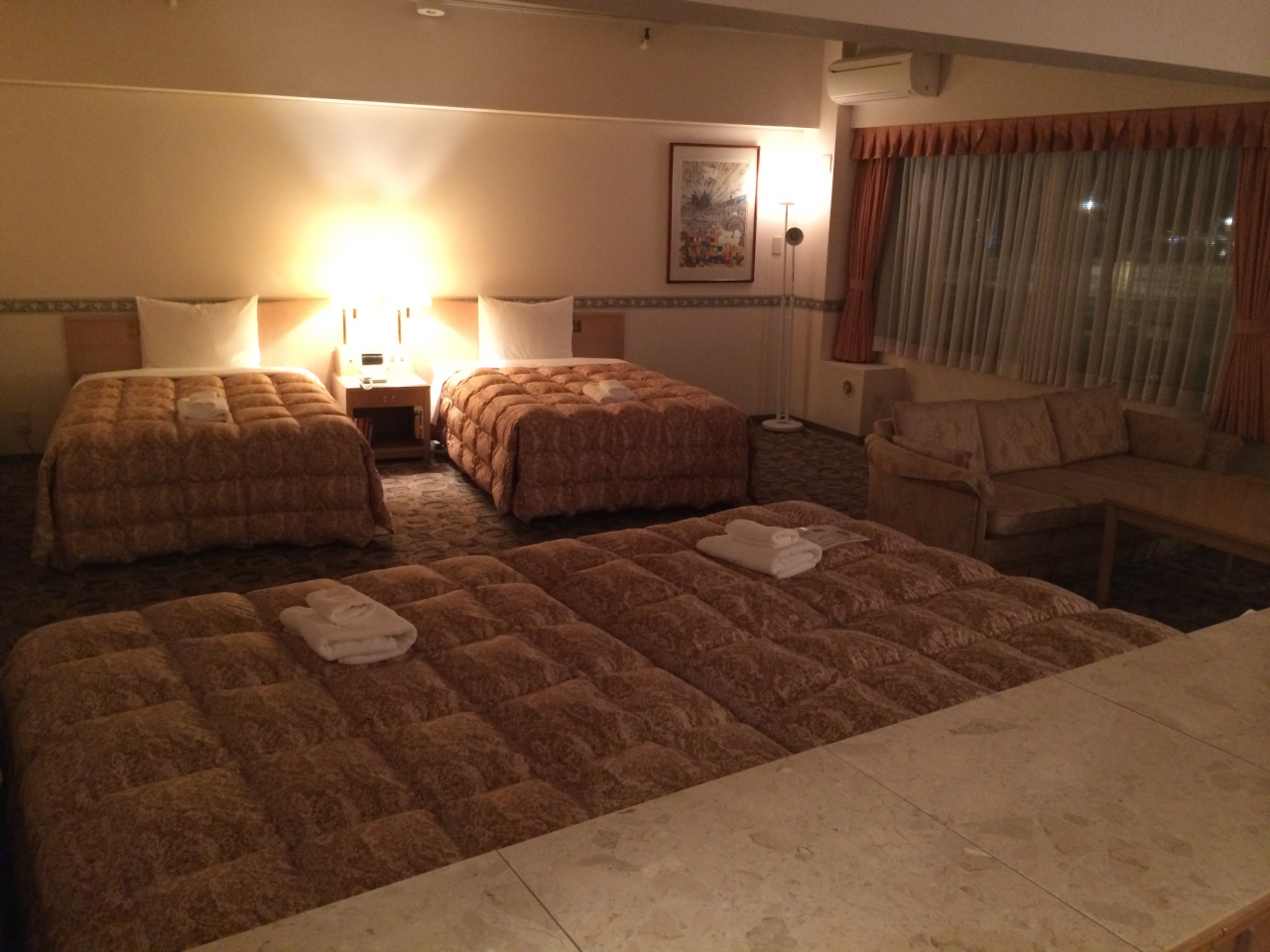 今回はファミリールーム(4人部屋)に3人で宿泊しましたが、大きな部屋にベッド4つがゆったりと並んでいて、ソファーなどのくつろぎスペースもありました。広すぎて落ち着かないほどです。