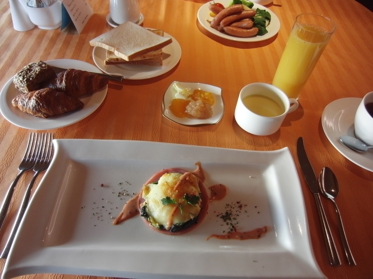 夕朝食つきで、夕ご飯はフランスのコース料理、朝食はポーチドエッグがとても上品で美味しかったです。夕ご飯は量は少な目のため、ワインなどたしなまれる方にはちょうどいいと思いますが、私たち夫婦は飲めないので少し物足りない感じでした。