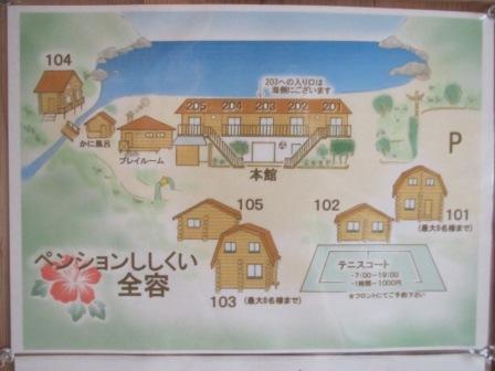 宍喰の市街地からは少し離れた波打ち際に立地。フロントのある本館を中心に、いくつか丸太小屋が点在しています。この日は本館の客室を利用。2人部屋のようですが、3部屋+海に向かってベランダがあり、別荘に来た気分です。