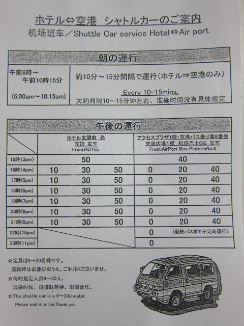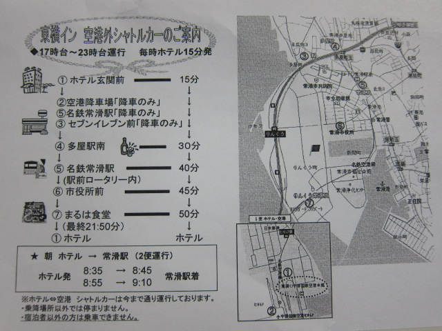 6,000円弱の値段で、このサービス及び朝食、空港−ホテル間シャトルサービスがあるのはさすがで今まで利用していてうれしい事だったが、もうひとつすばらしいサービスがある。それは、プチ観光・お買い物めぐりができるシャトルサービスで、添付写真に詳細もあるのだが、ホテル−常滑駅間を途中いろいろ寄りながら回ってくる。途中停車は空港、セブンイレブン、多谷駅南、常滑駅、市役所、まるは食堂そしてホテルというルートだ。