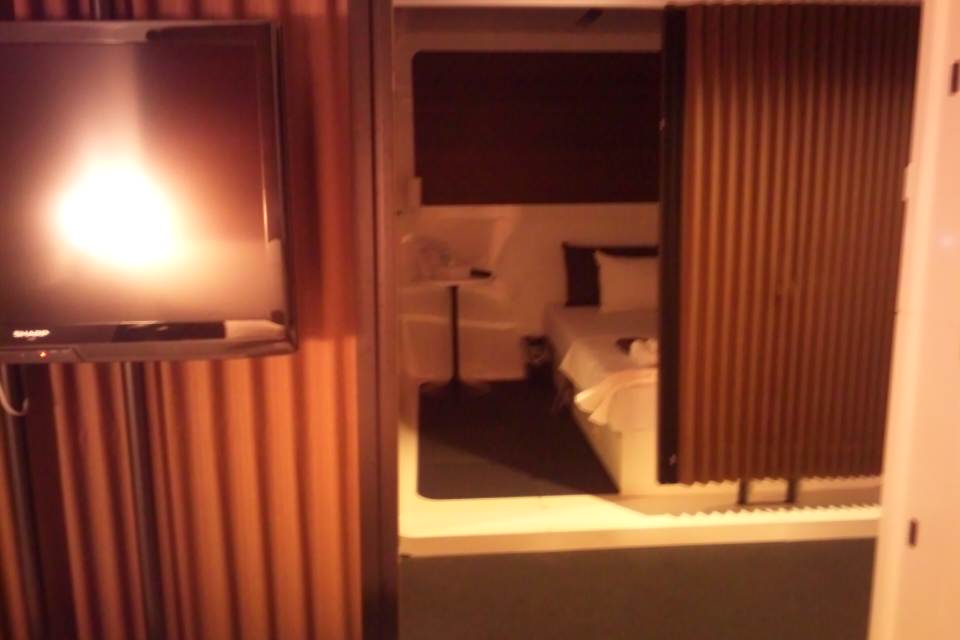 個室内にはベッド、TV、ヘッドフォン、小さな丸テーブル、鍵付きの引き出しのみがある本当に寝るために必要なもののみがありました。