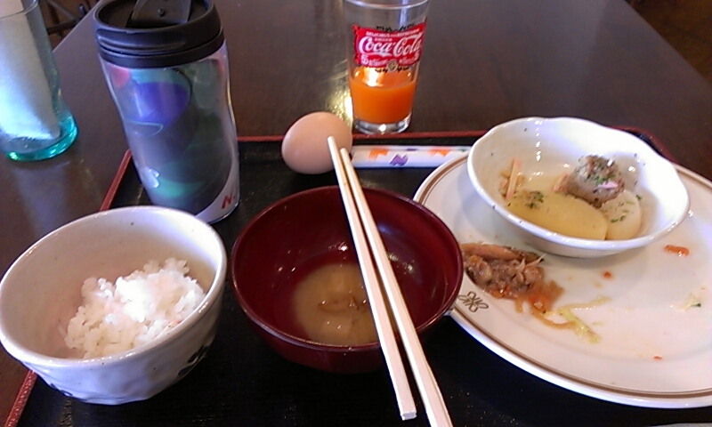 そして、朝食は…写真とぜんぜん違う…。メニューが少ない…。静岡おでん風おでん(こんな表現のおでんです)がメインディッシュでしょうか。ただ、お米がとてもおいしかった。