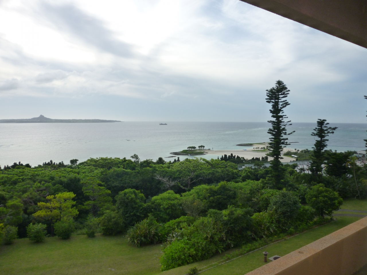 ホテルはオーシャンビューで、エメラルドビーチ、伊江島、東シナ海が望めとてもきれいです。