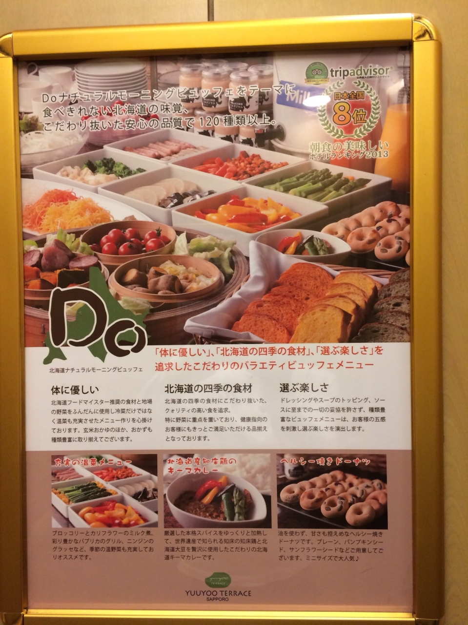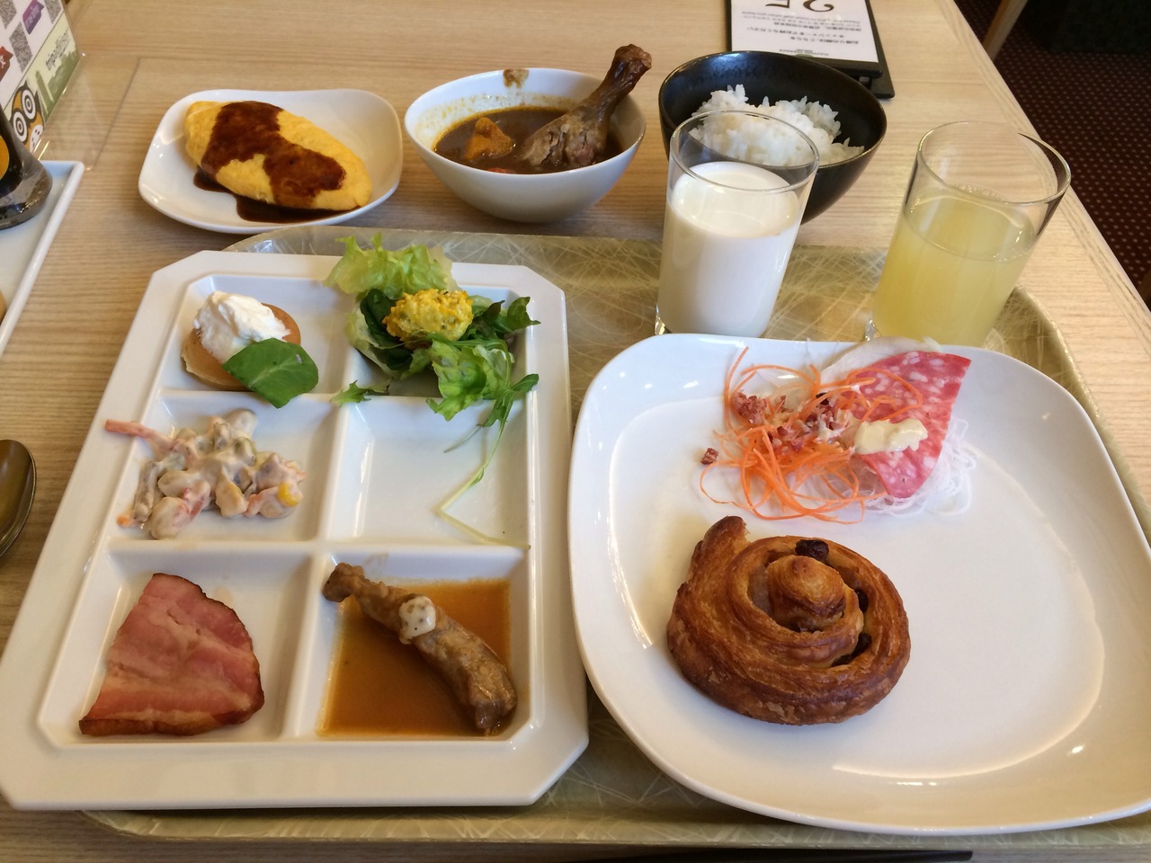 また、口コミ通り朝食が素晴らしいです。何を食べようか一回りした時にどれもこれも美味しそうで、どれから取るか迷ったくらいです。厚切りベーコン、スープカレー、パンプキンスープなど北海道の食材が満載で、一つ一つの味が良いです。その場で焼いてくれるオムレツにも3種類のソースがあったり、ジャムやドレッシングも何種類もあります。パンも暖かいまま出されており、特にクロワッサンのサクサク感には驚きました。朝食なしのツアーだったので1890円払いましたが、大満足の内容でした。