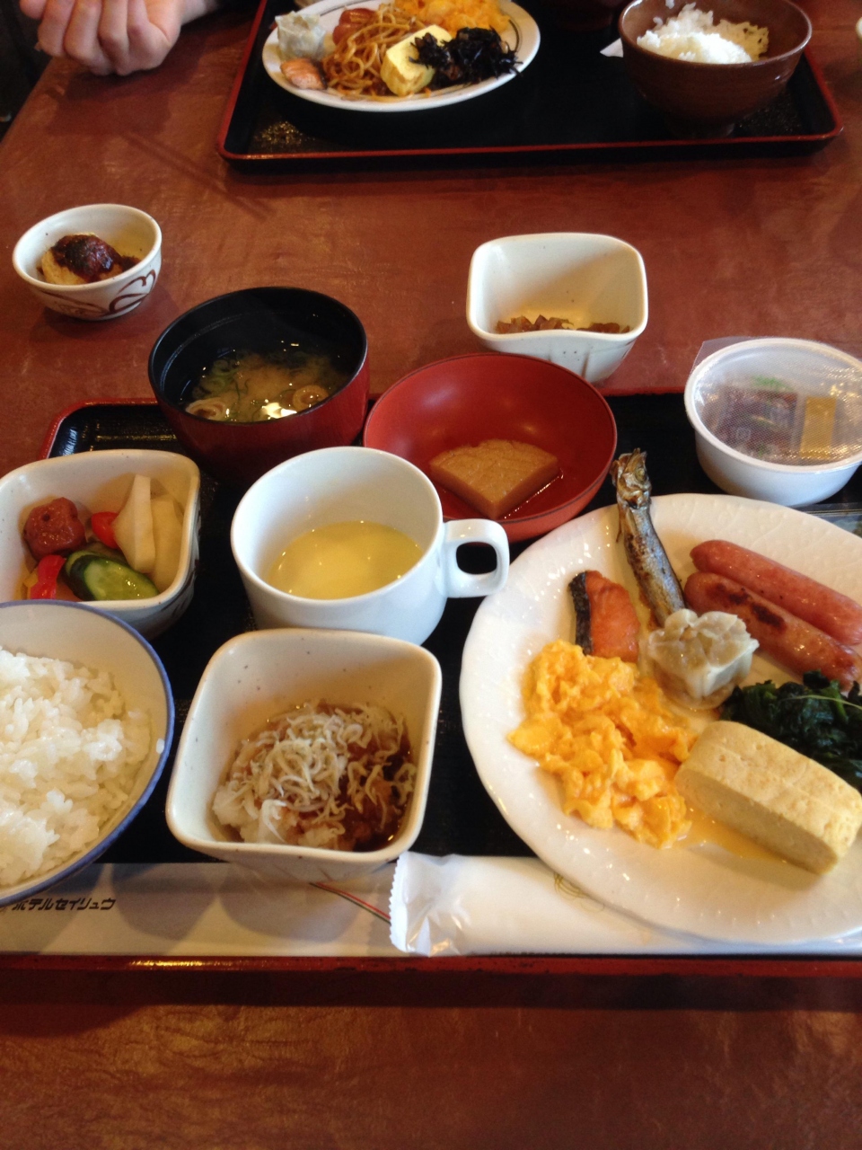朝食は、バイキング。「関西一を目指してます」とのキャッチコピー。でもまあ、普通のバイキングというところで可もなく不可もなし。驚くべき所は、朝からタコ焼きを焼いてた所。さすが大阪。しかし、もう一つ不思議なことに、タコ焼きの横にコンロと小さいフライパン、卵を溶いた物があったので、オムレツを焼いてくれるのかなと期待したが、ただ、置いてあるだけだった。期待外れもいいところ。これでは、関西一は難しいでしょ。とツッコミたくなった。