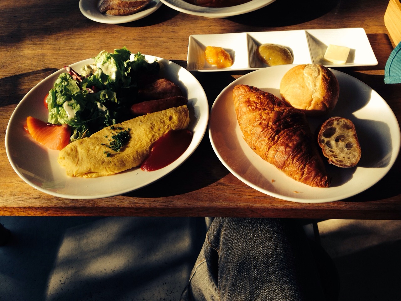 なかでも、モーニングは超オススメ。いくつかセットとアラカルトがありますが、1300円のセットはボリュームも満点。3種の焼き立てぱん、ジャムは日替りで、今日はマーマレードとルバーブ。さすがの焼きあがりのオムレツに、ぶ厚いベーコンとソーセージ。美味しいサラダ。選べるジュースはグレープフルーツお選び、珈琲ももちろんセットです!こんなに美味しくてかわいいお値段でよいのかしら!と、いつも感動します。