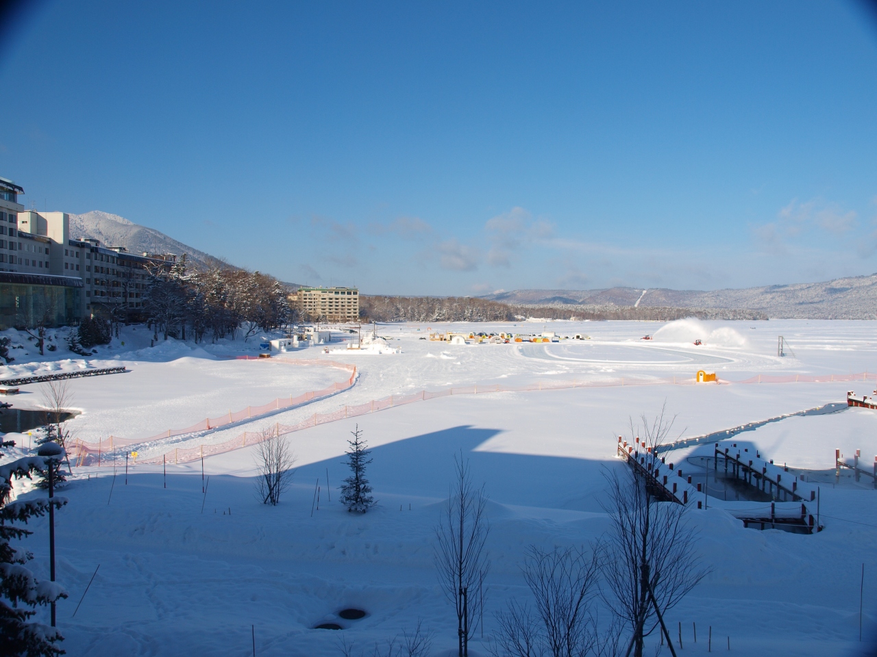 写真のように凍った湖が一望でき、この日行われた花火も窓から見えましたので満足です。