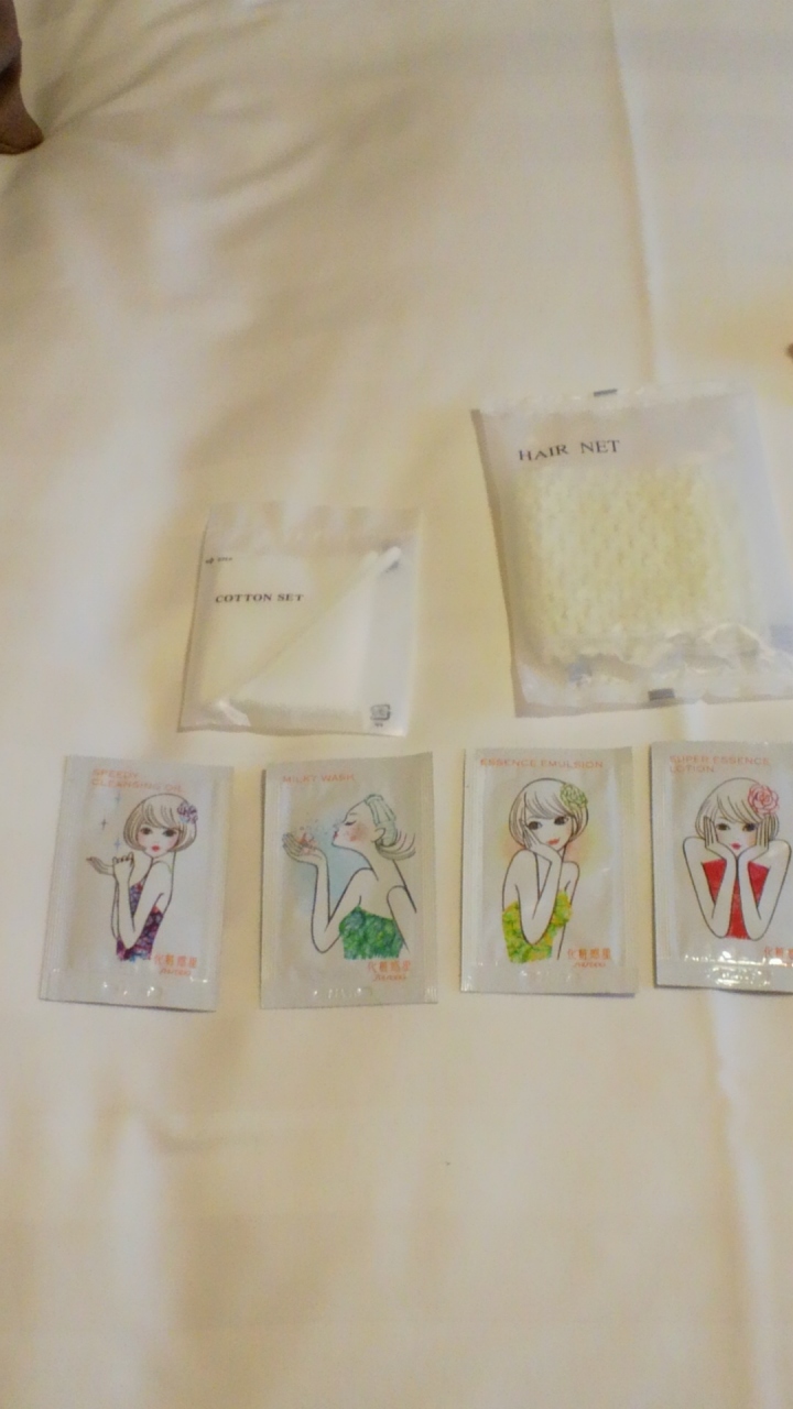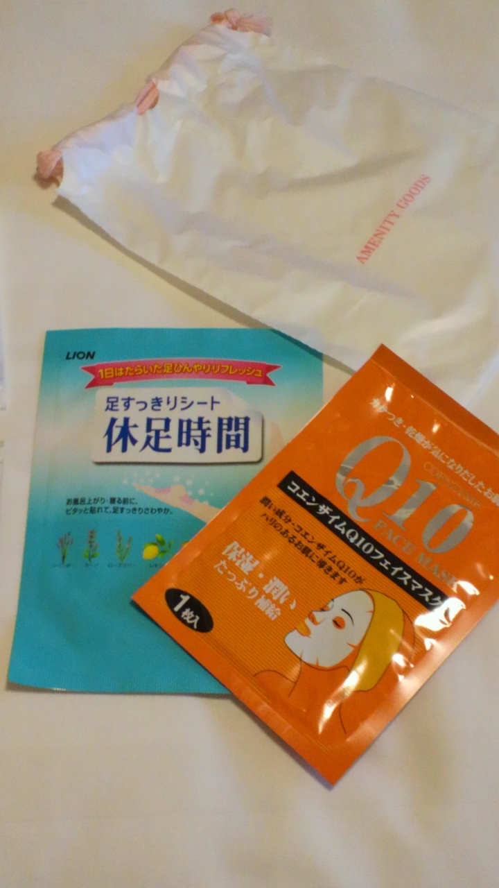 アメニティは、化粧惑星のクレンジング・洗顔フォーム・化粧水・乳液とシートマスク、足のリラックスシートにコットンセットとヘアバンドです。あるとちょっと嬉しいですね。