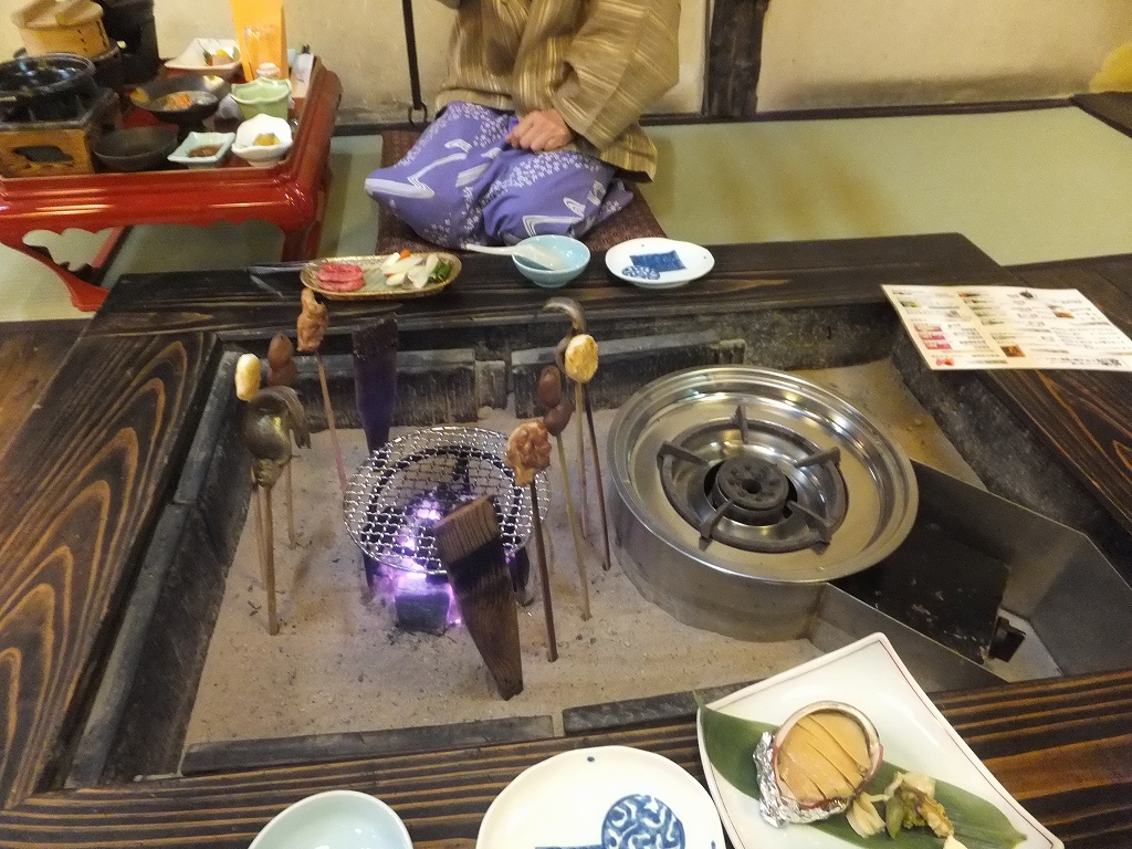 食事:囲炉裏を囲む 「平家お狩場焼き」 家庭では味わえないシチュエーション。