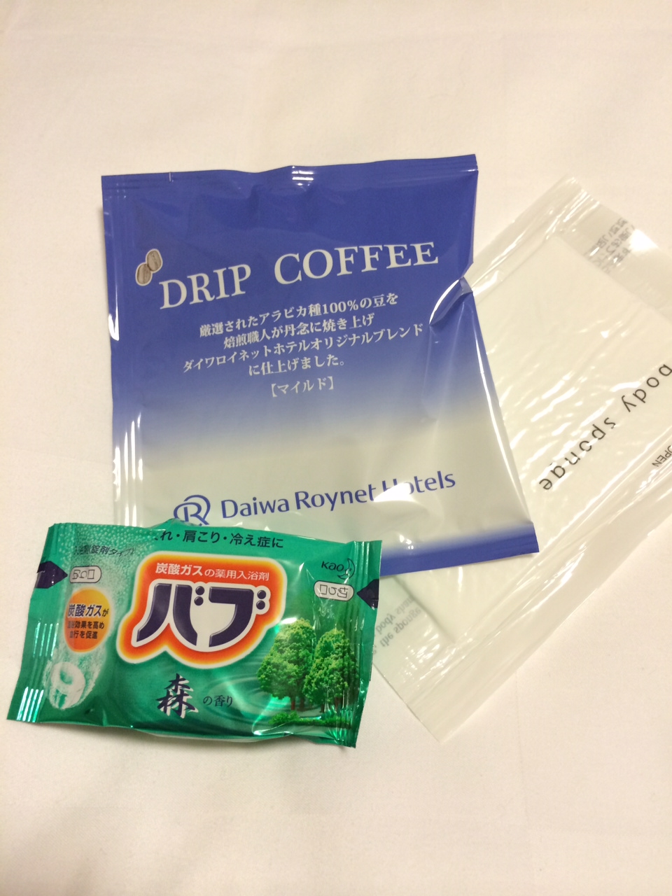 チェックインの時に、フロントでアメニティを選ばせていただきました。(女性だけだったかもしれません)ボディスポンジと入浴剤を選択。インスタントコーヒーもくれました。