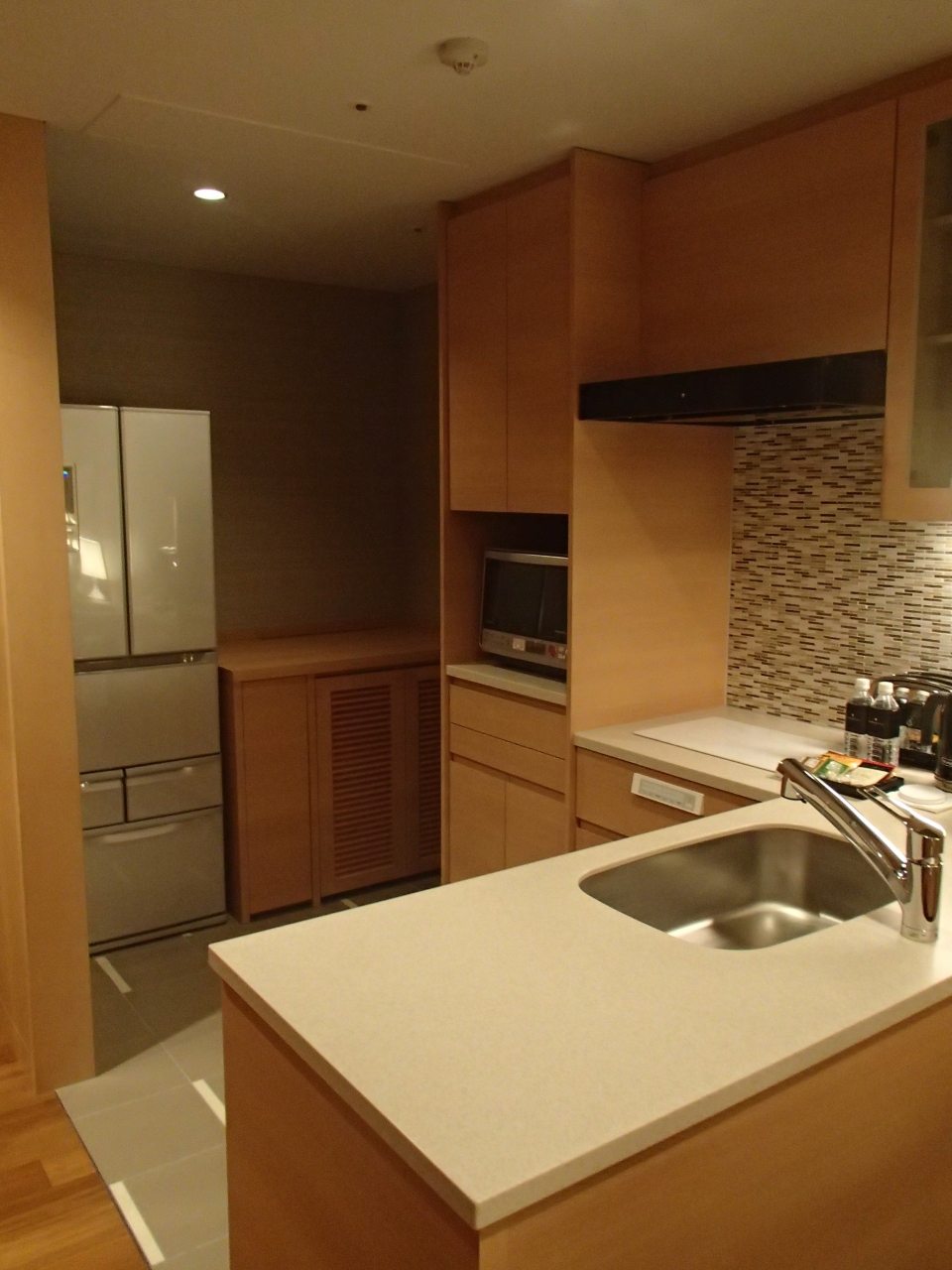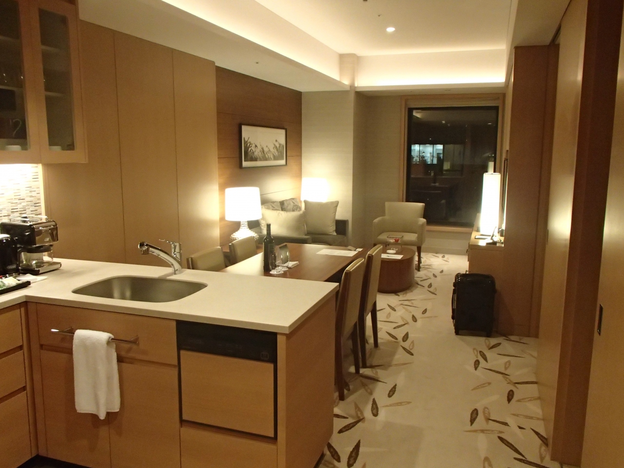 この部屋は長期滞在用にも使える部屋として作られたそうで、部屋のドアを開けるとすぐ左にキッチン、その奥にリビングルームがあります。
