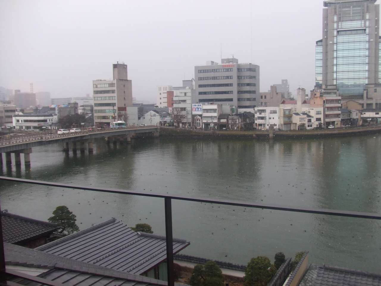 宍道湖大橋を望む温泉風呂付の部屋で真下には宿自慢の庭園も見えて眺望は最高でした。堀川遊覧船乗り場までもすぐ近くで立地は便利です。