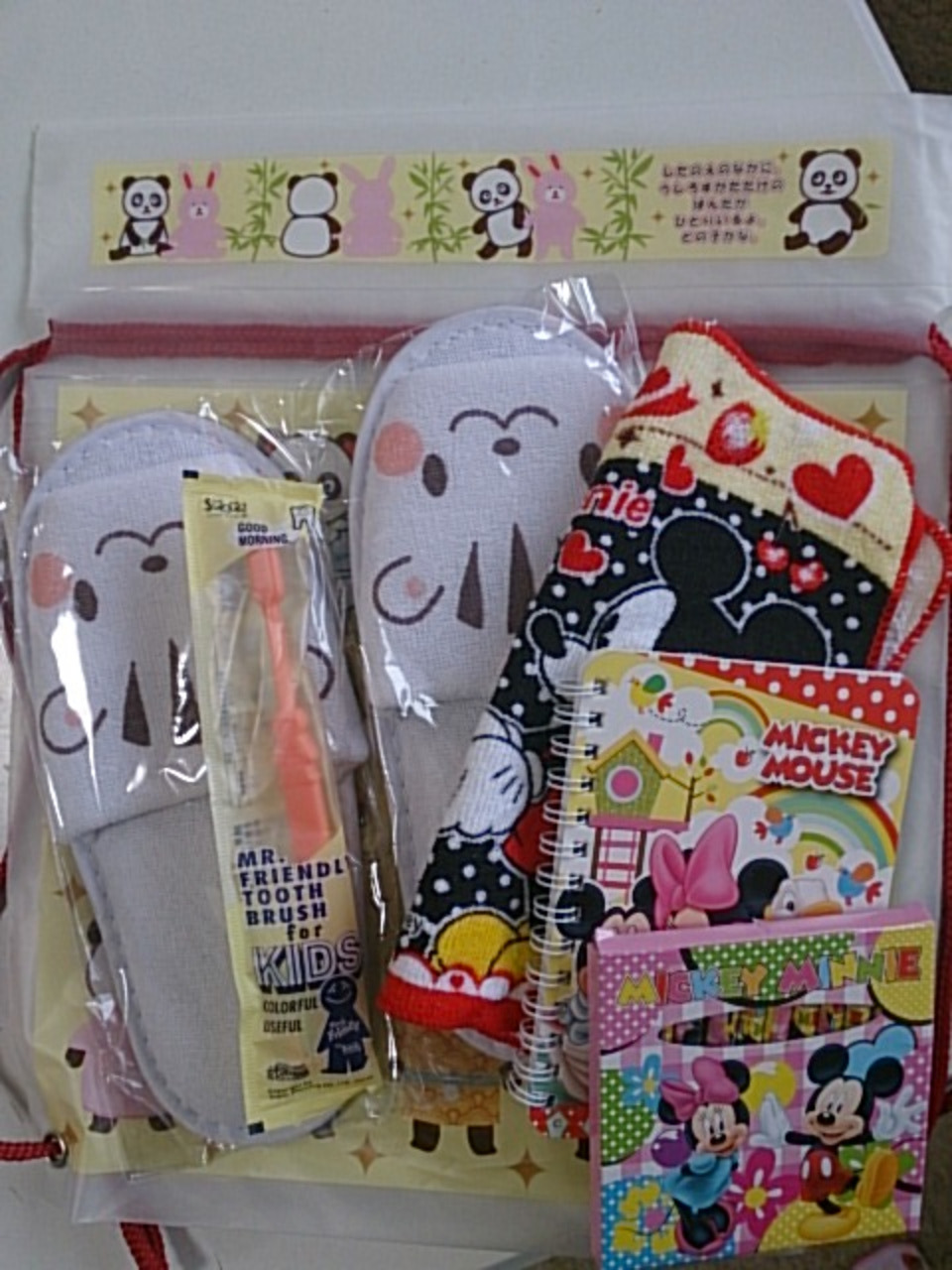 予約時に2才添い寝ありとコメントに記入。するとチェックインの時に備品くれました。かわいいポーチにはいり、ハンカチ、スリッパ、ノート、クーピー、