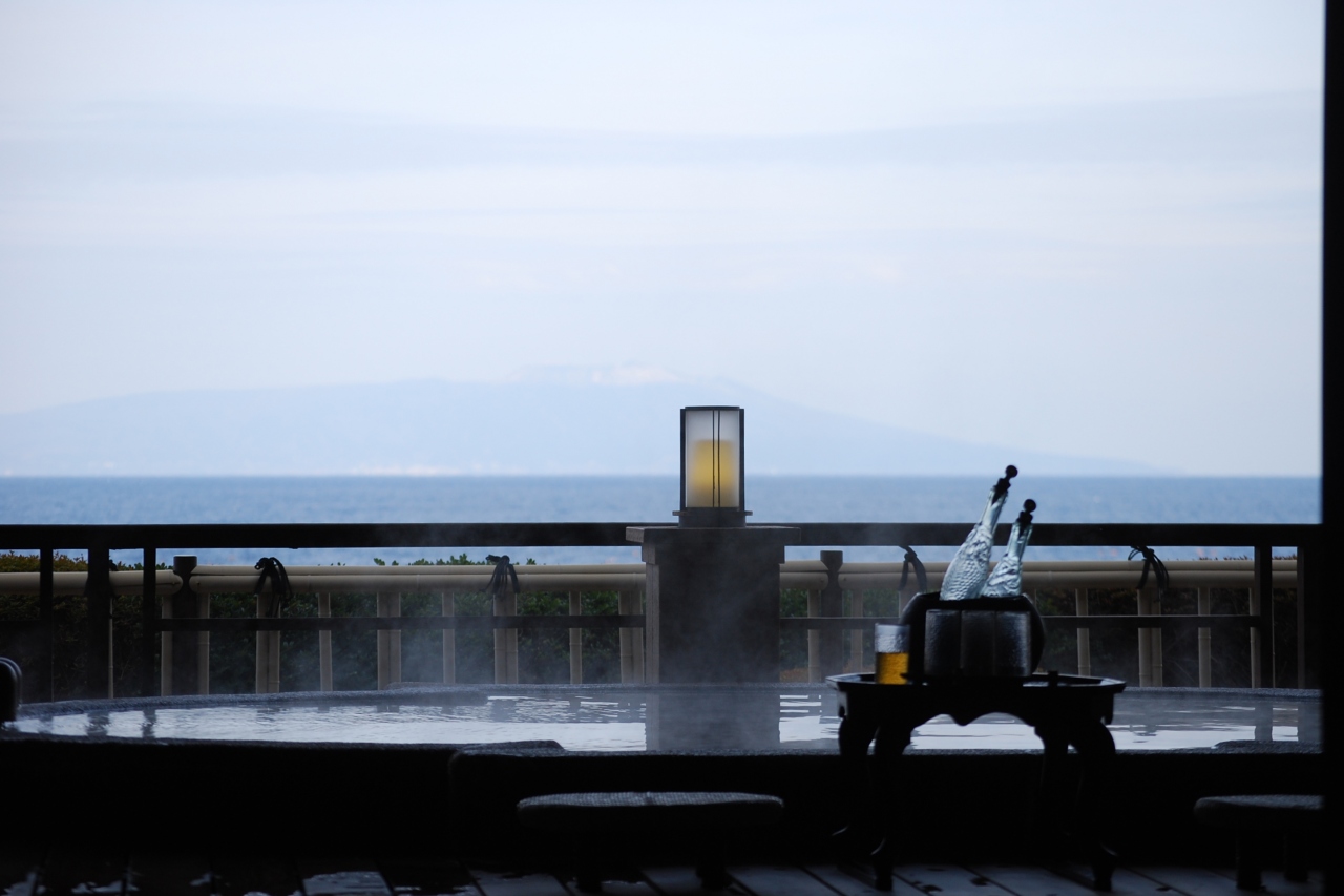 絶景の露天風呂が掲載されている 「びゅう」踊り子号で行く伊豆 のパンフレット表紙に惹かれ、行って来ました。平日限定ながら、交通費込みでとてもリーズナブルなお値段でしたが、色々なリクエストにも応えてくださり、また接客も熟練の仲居さんをはじめ気持ちの良い時間が過ごせました。圧巻は目の前の海。大島を海の向こうに眺めつつ、豪快な波しぶきも感じながらガゼボという貸切露天風呂に浸かり、贅沢を独り占め。お料理も美味しくゆっくりお部屋でいただけます。お天気ならば月見、日の出も素晴らしいでしょう。