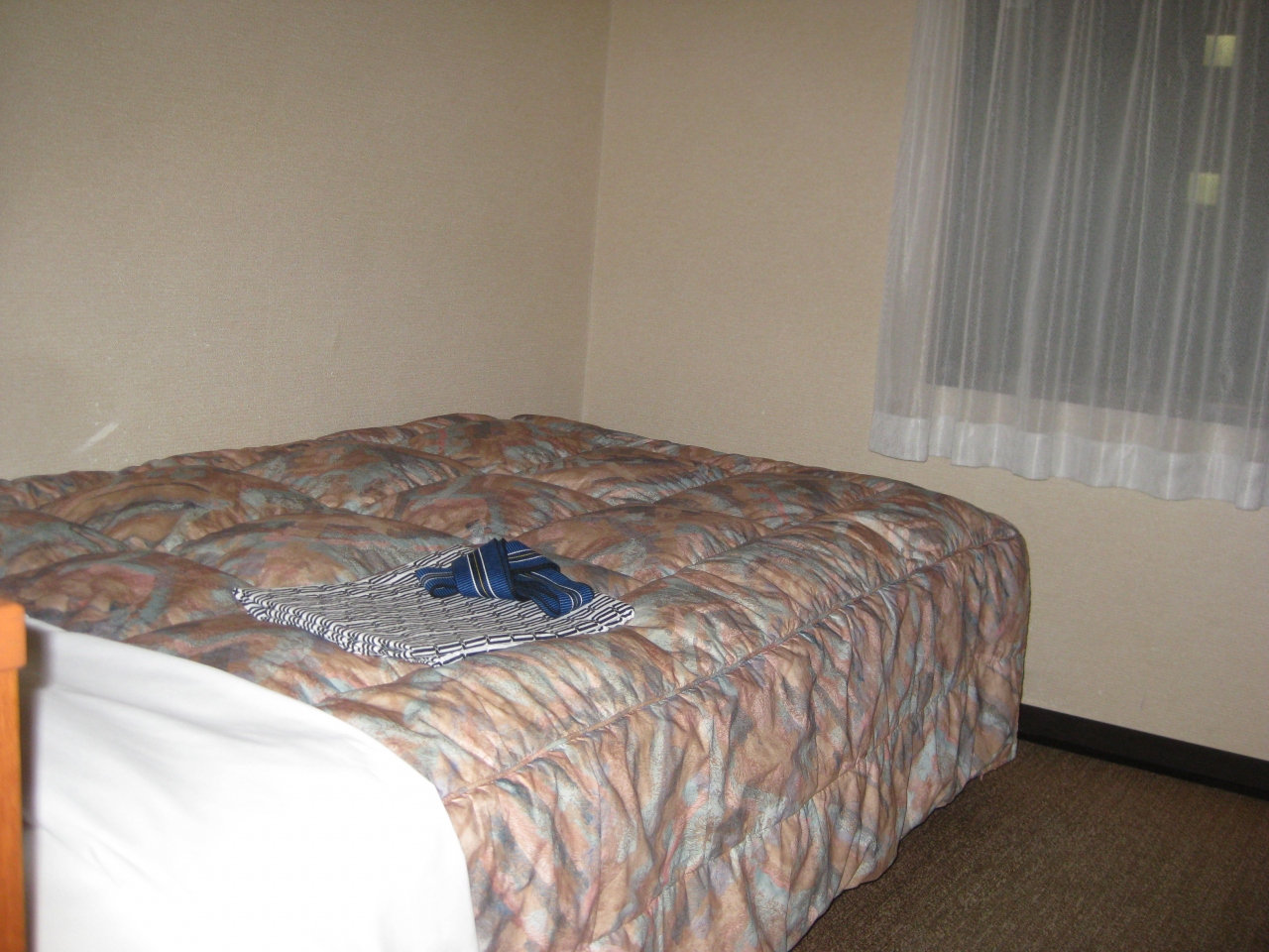 部屋は狭いが必要なものは全て揃っている。テレビ、冷蔵庫、ウォッシュレット、ドライヤー、石けん、シャンプー類、浴衣まで。外国の安いホテルではこうはいかない。