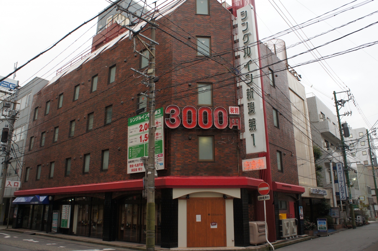 シングルイン新潟第1は、新潟駅から歩いて5分。辺りにはホテルがいろいろあって、競争が激しいんでしょうか。ここは、一泊3000円からの大きな看板を掲げて安さを猛アピールしていました。