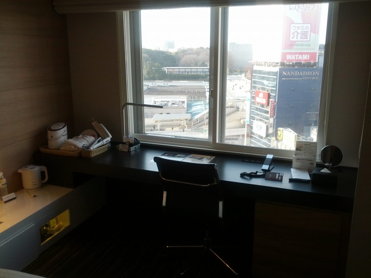上野駅のコンコースから見えます。行く途中に東京スカイツリーも見えました。フロントは1階にあって、入り口から入ると突き当りがフロント。そして手続きが終われば、ぐるっと回ってエレベーターへ。なので館内に入ってエレベーターに乗るには必ずフロントのまん前を通らなければなりません。なので不審者は入りにくい形です、エレベーターもカードキーを照らさないとその階にしか行けないようになっていてセキュリティは万全でした。さすが三井ガーデンホテルです。客室からは上野駅が見えて、山手線が頻繁に走っているのが見えましたが電車の音はほとんど聞こえませんでした。防音も優れていました。広々とした客室はシックで落ち着きがあり、インテリアも素敵で本当に快適に過ごせました。机も広々としていて、電気スタンドがちゃんとあって仕事をするにも不便することはありませんでした。ズボンプレッサーもあり、ビジネスマンには最高のホテルです。私が宿泊した部屋はレディース用?も兼ねていたのか、フェイス用のスチーマー、女性専用の神をストレートにさせるようなドライヤーなどがありました。女性の方はあらかじめリクエストすればこの部屋にしてもらえるかもしれません。ミネラルウォーターが無料であったのも助かりました。